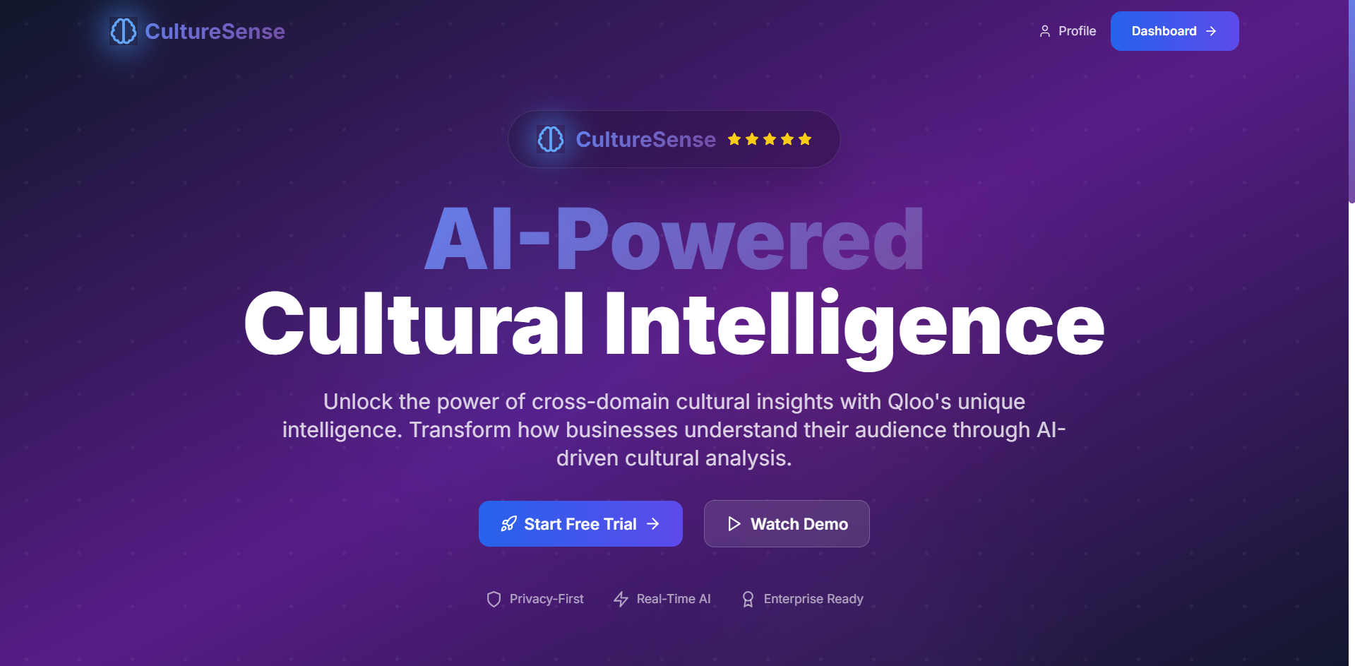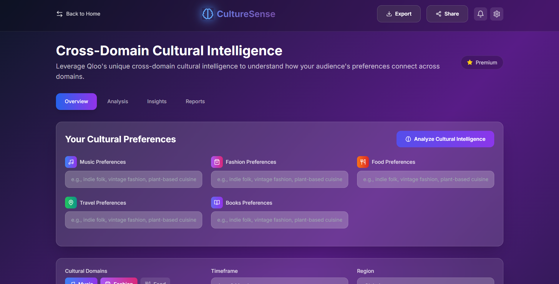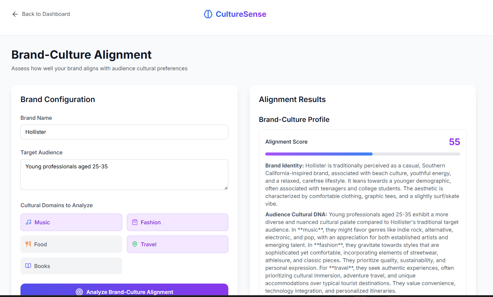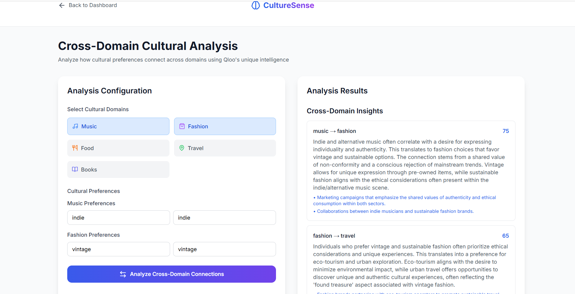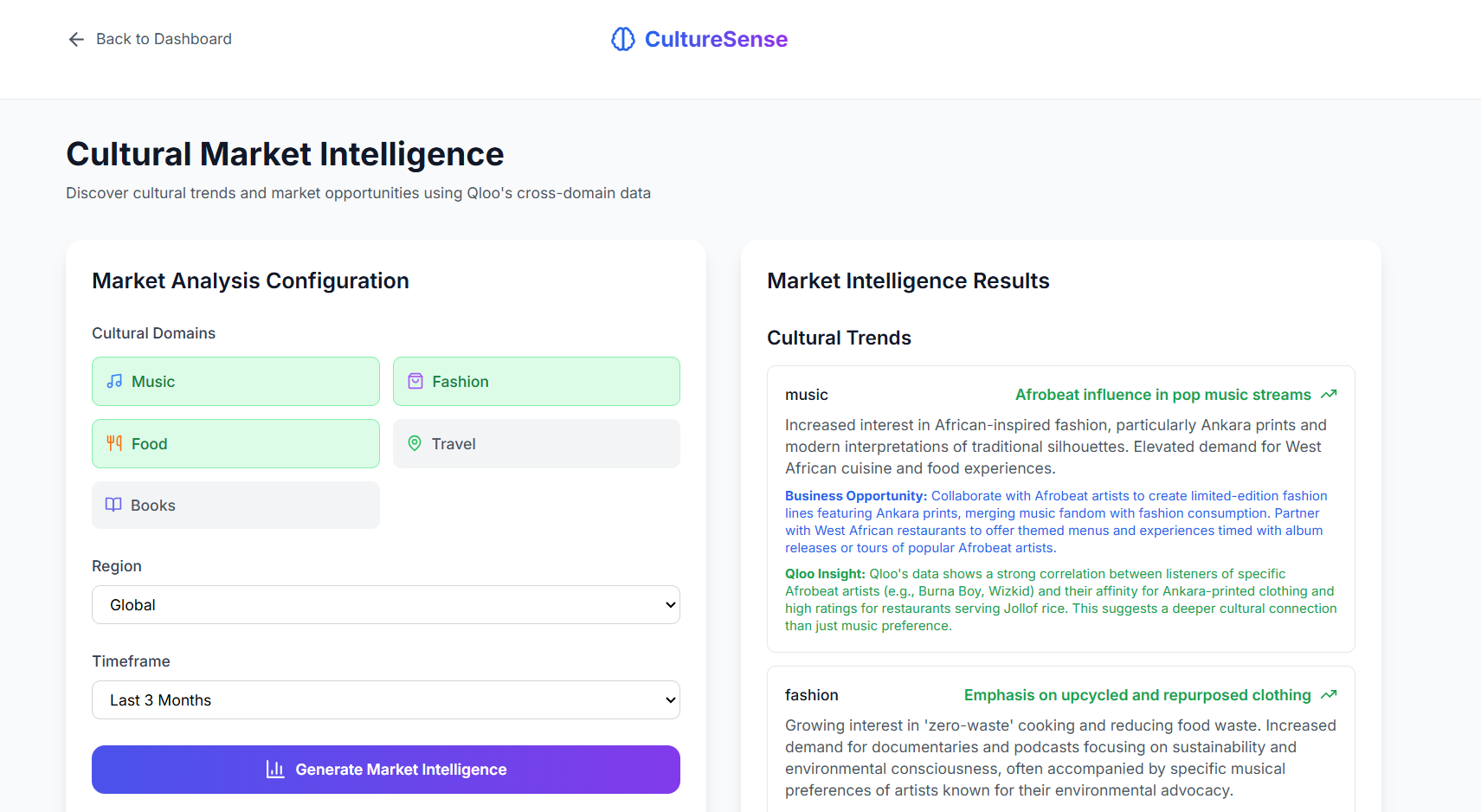 CultureSense is an AI-powered cultural intelligence platform that helps individuals and brands understand cultural affinities across music, food, fashion, travel, and more.