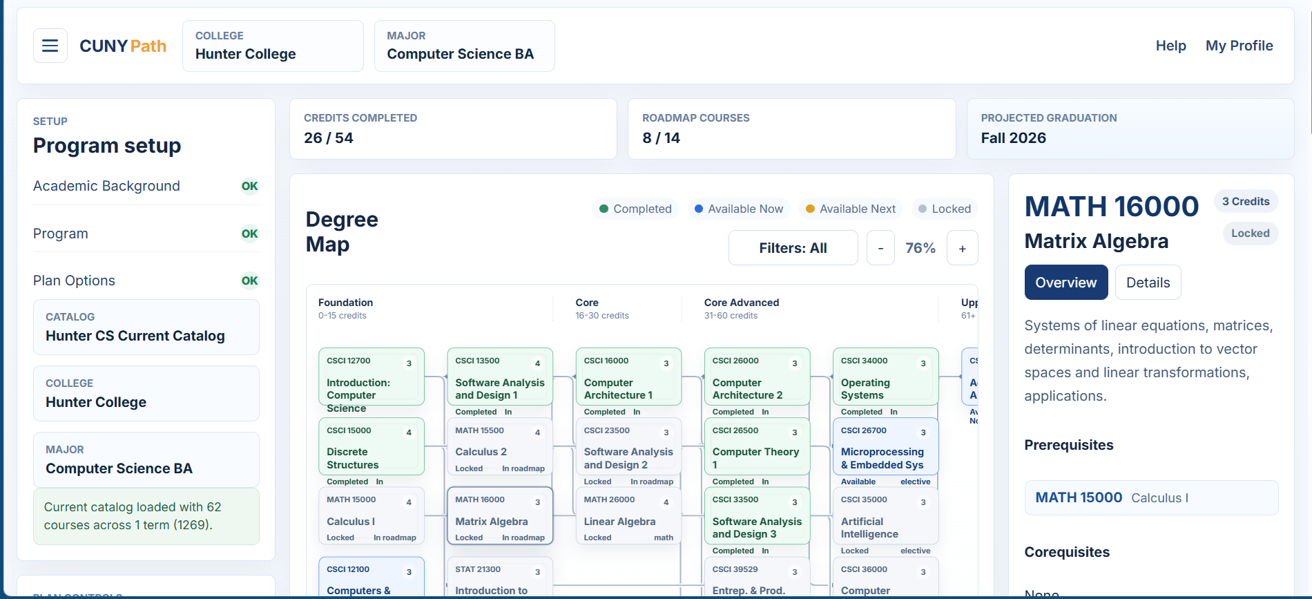 Right now, the app is focused on Hunter CS degree planning. The long-term goal is to expand CUNYPath to support more majors, more departments, and eventually more CUNY colleges.