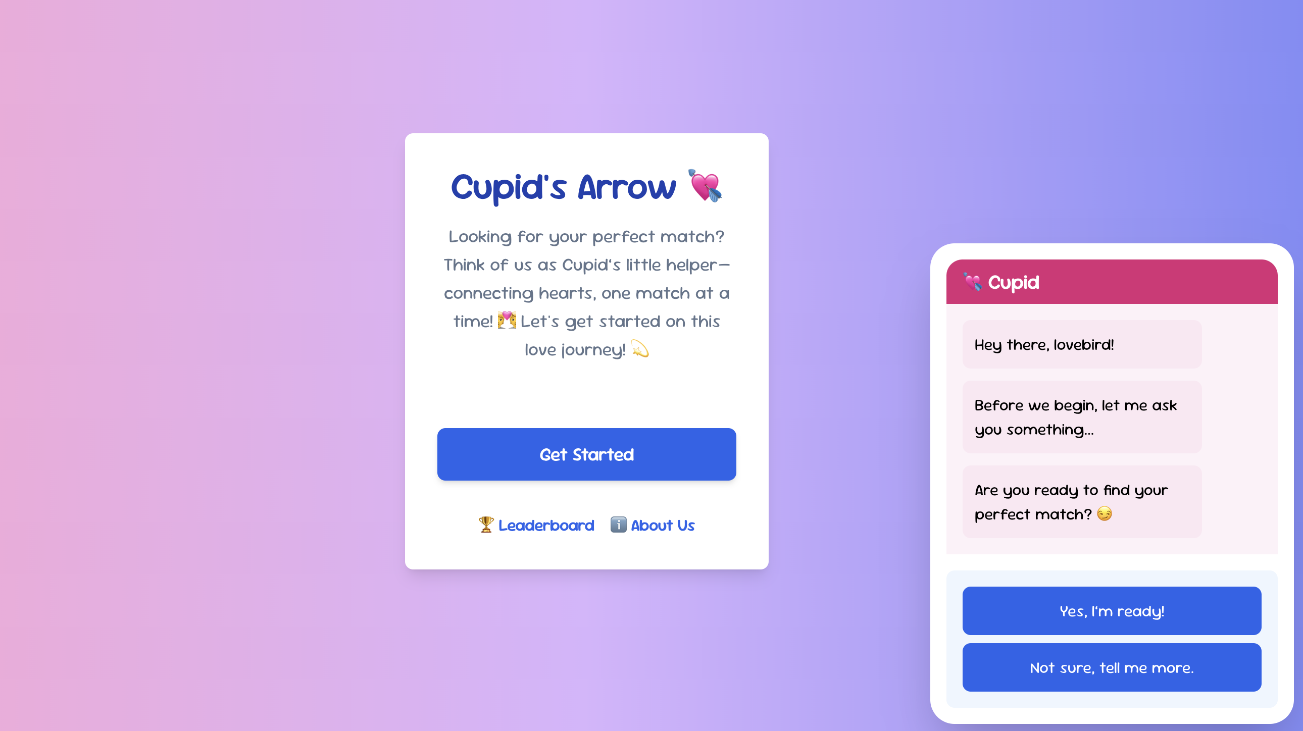 We were inspired by the inefficiencies and biases in traditional matchmaking platforms. Many modern apps tend to prioritize superficial metrics like appearance or popularity over genuine compatibility. We wanted to build something that emphasizes deeper connections using a scientific approach. That's how Cupid's Arrow was born — blending the Gale-Shapley algorithm with thoughtfully designed survey questions to match people based on compatibility.