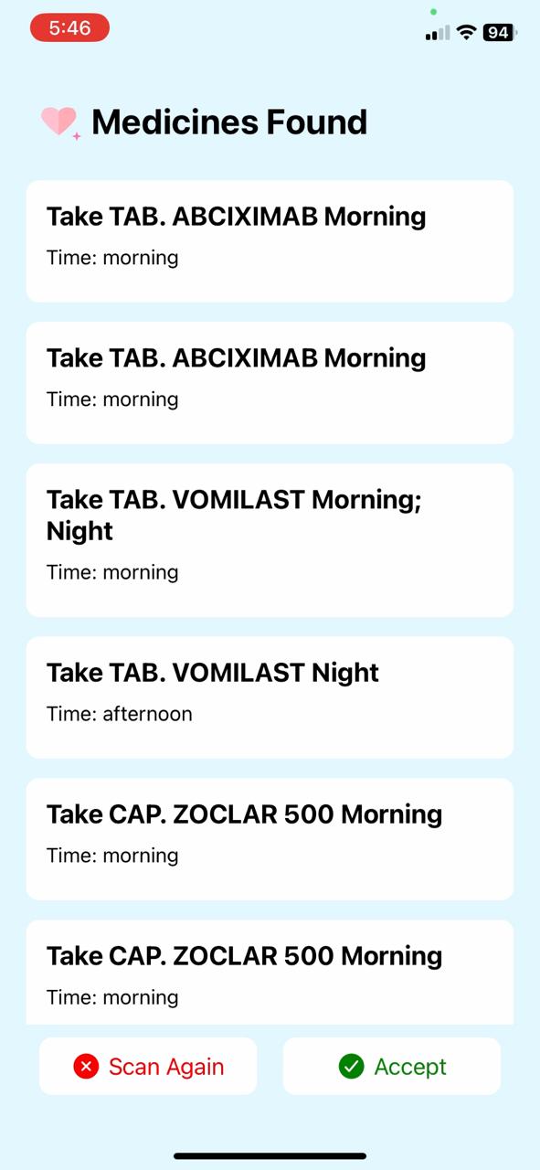 We used React Native (Expo) to build the mobile app, ensuring compatibility across Android and iOS devices. For local data storage, we used SQLite, allowing the app to store and retrieve user reminders even without internet access. To process scanned discharge reports, we integrated EasyOCR, a lightweight open-source OCR engine. The extracted text is then sent to a Groq-hosted LLM, which analyzes and converts it into structured medication instructions. We designed the UI in Figma, focusing on clarity and ease of use for all age groups. The result is a lightweight, fast, and intelligent healthcare assistant.