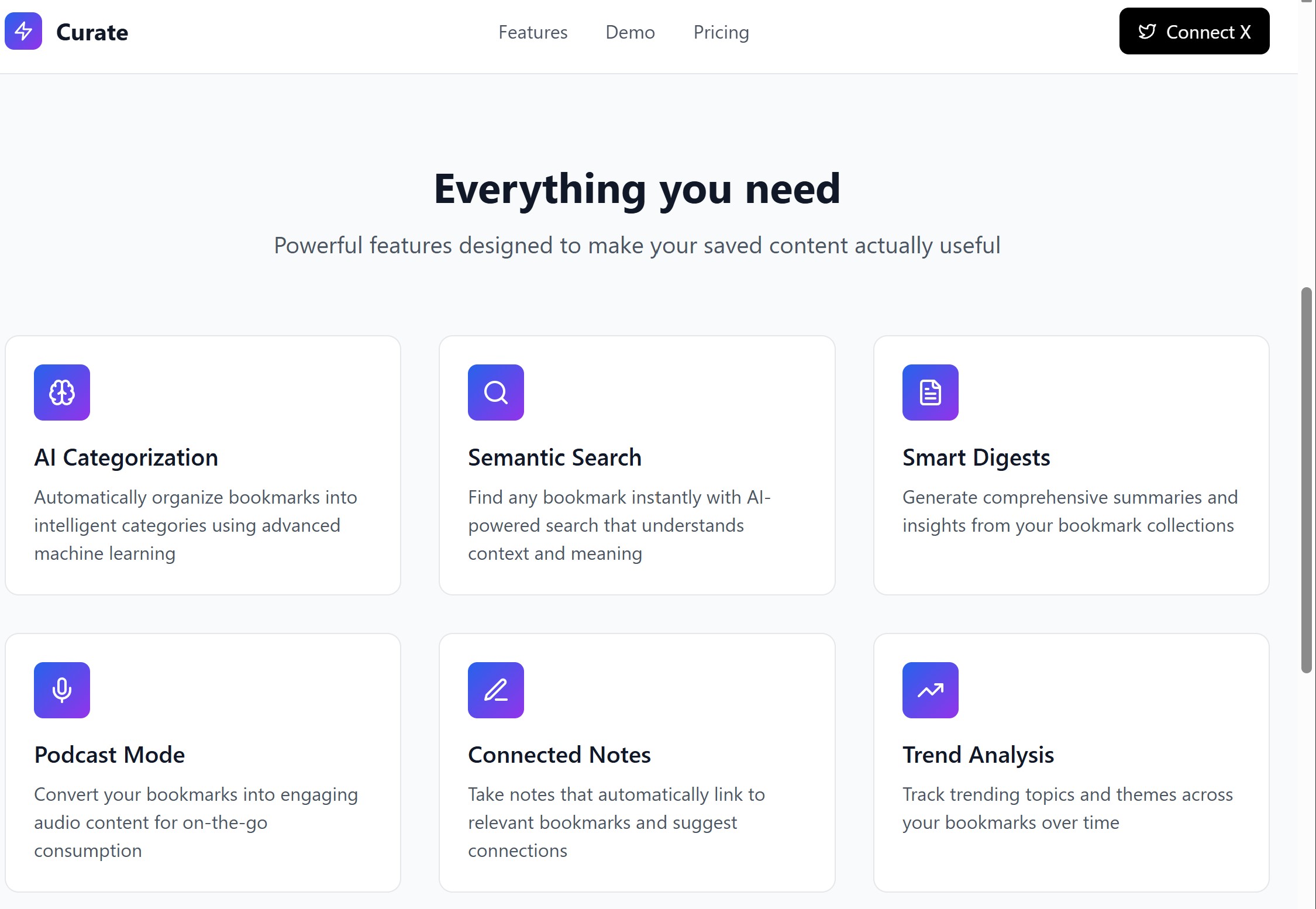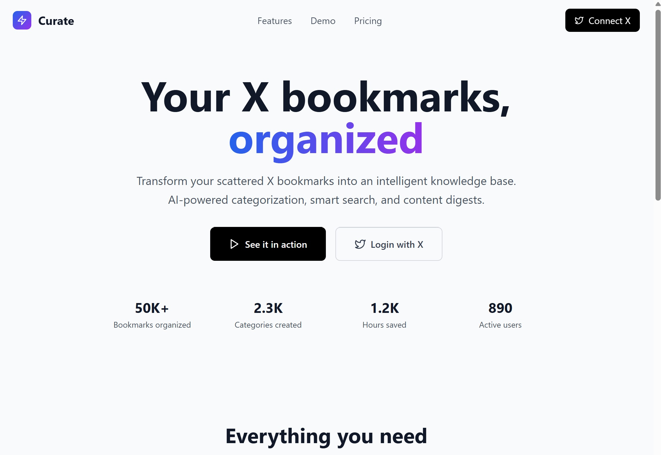 No more lost threads or forgotten resources — Curate helps you extract real value from your X bookmarks.