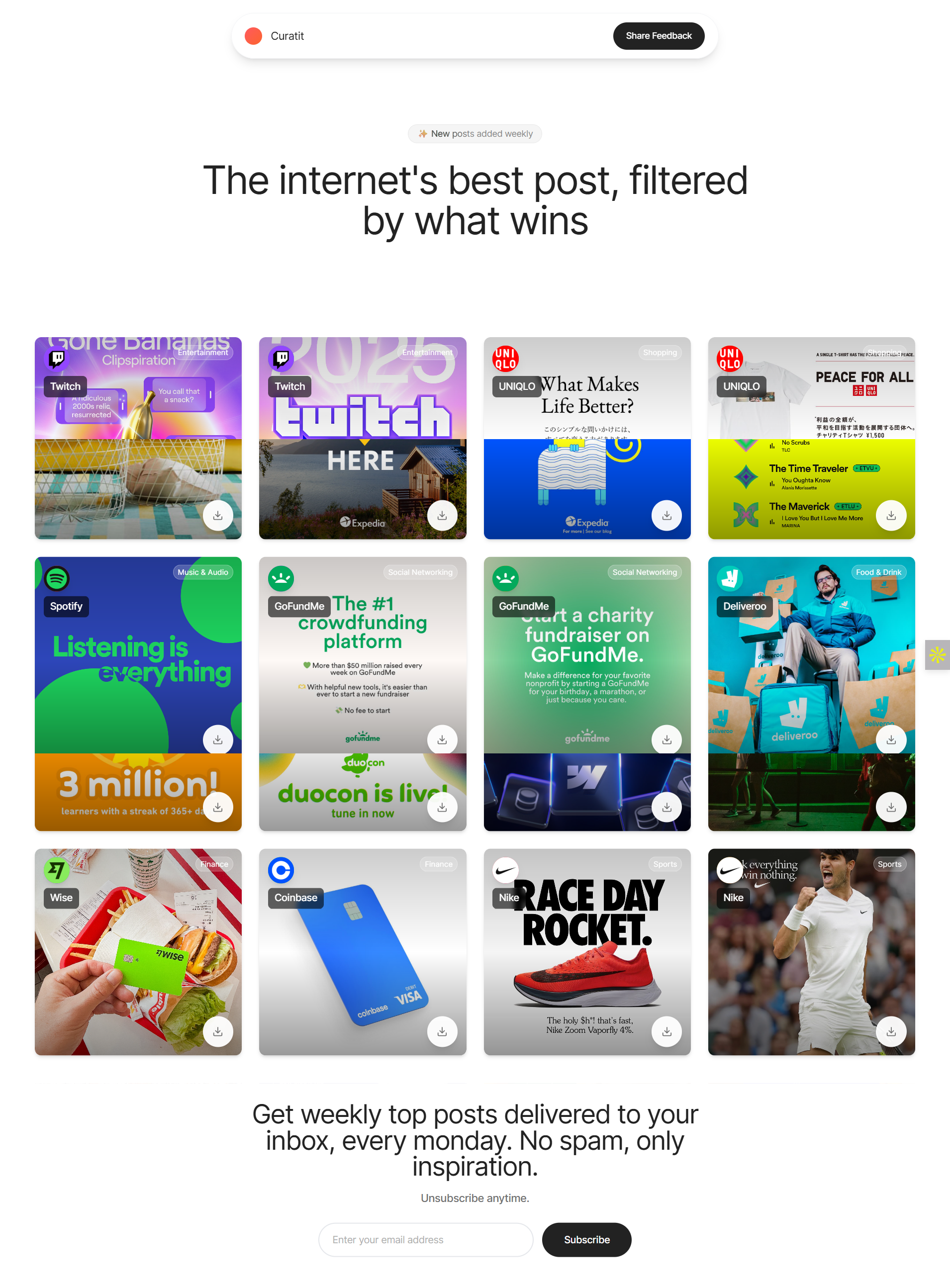 Curatit is a visual library of curated social media posts from top brands. It lets users scroll through a responsive grid with a unique elastic scroll effect, where each column moves at a slightly different speed. Every post is downloadable in one click, making it effortless to collect inspiration without opening multiple tabs or losing time in cluttered folders.