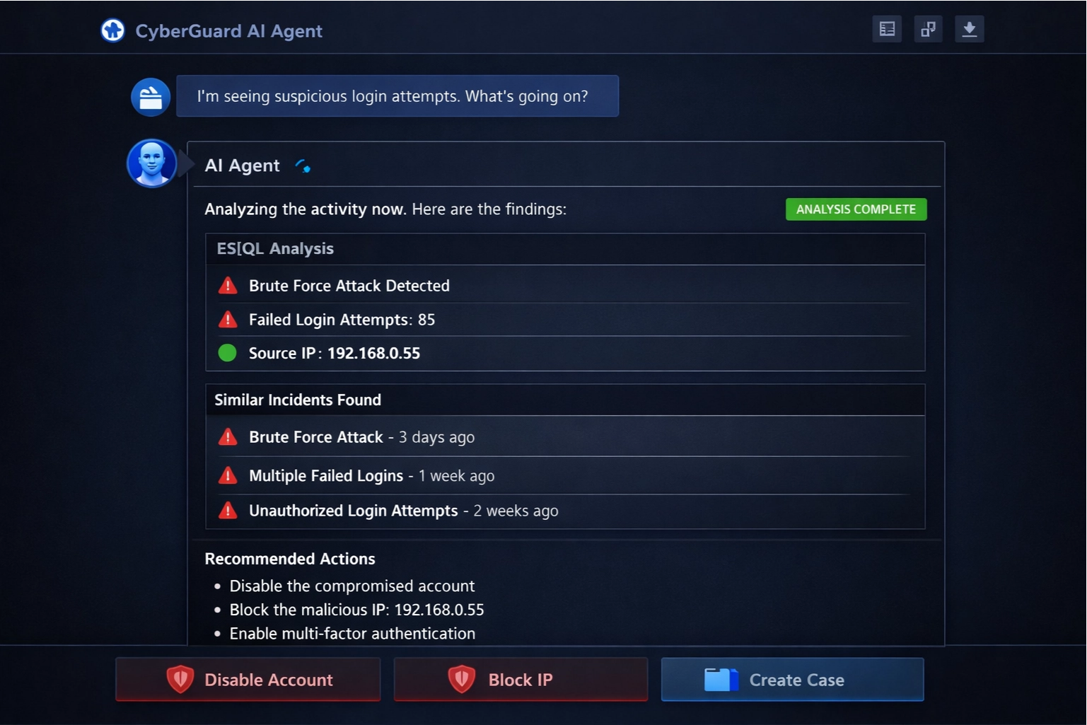 CyberGuard AI Agent automates the entire incident response workflow using Elasticsearch Agent Builder's multi-step reasoning capabilities: