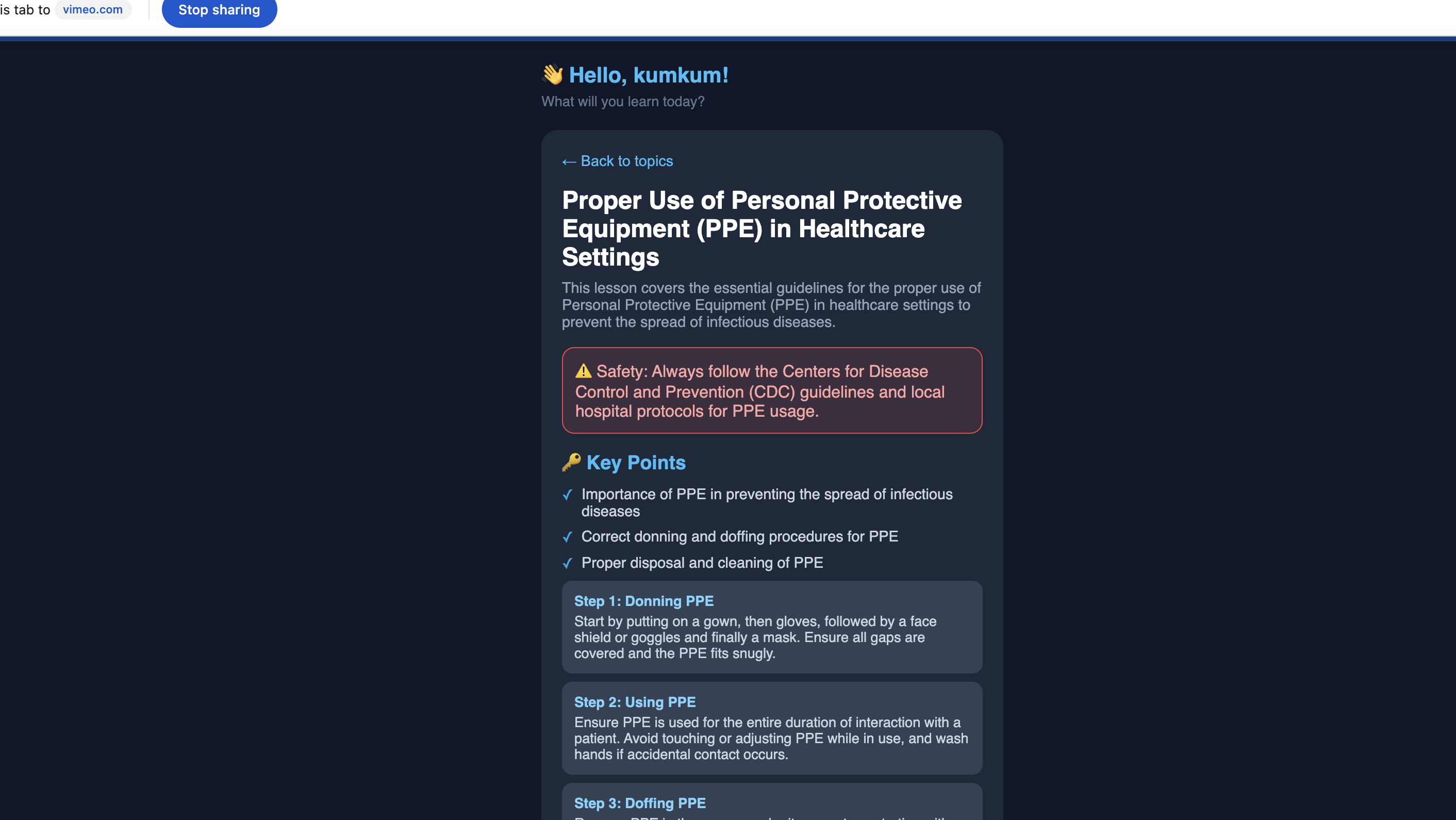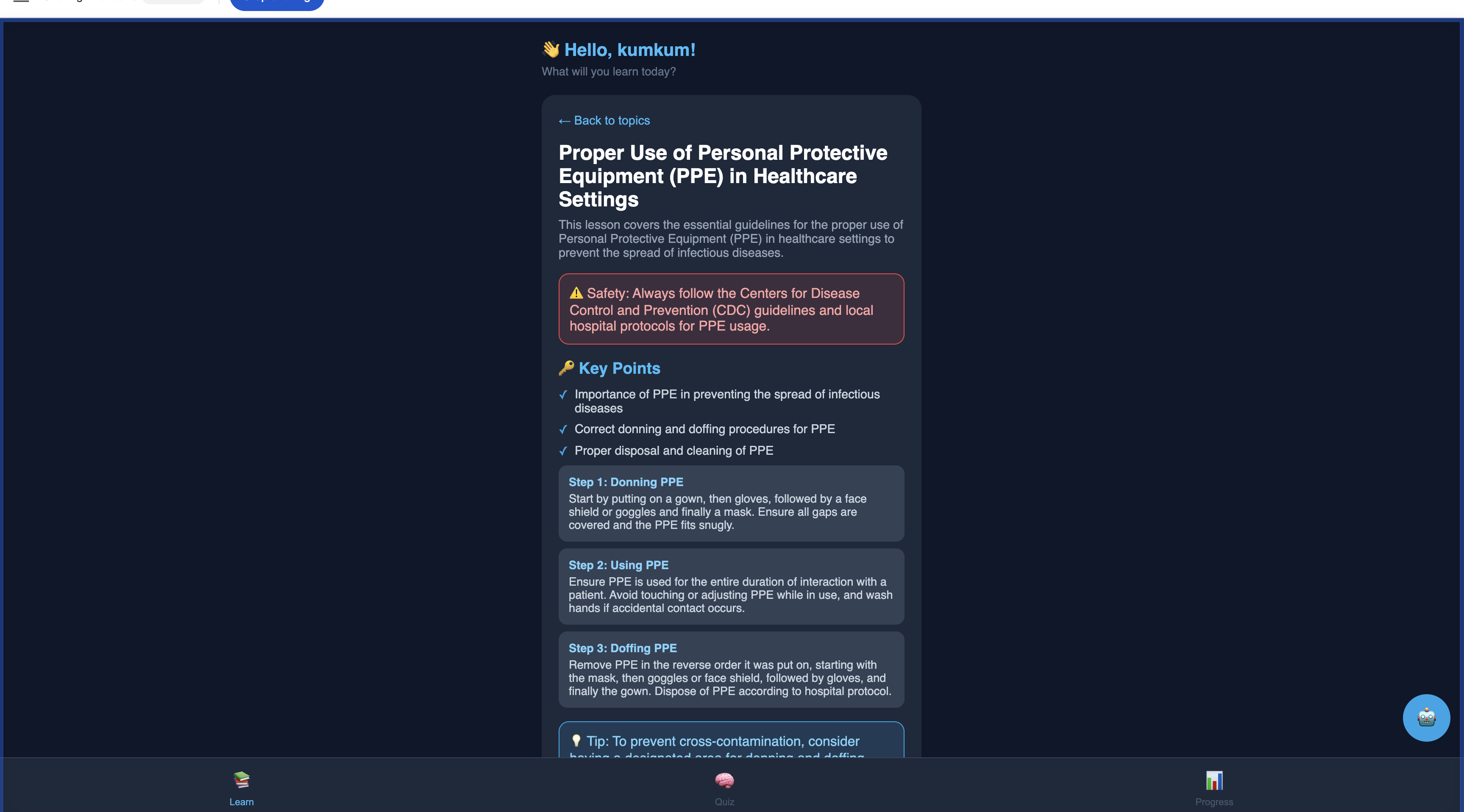 - Workers select their role, pick a topic, and get an AI-generated micro-lesson in seconds