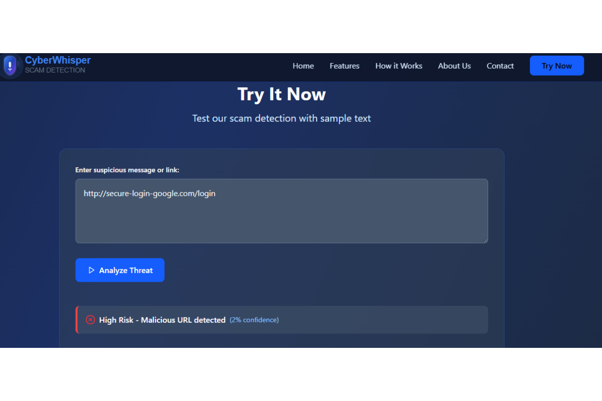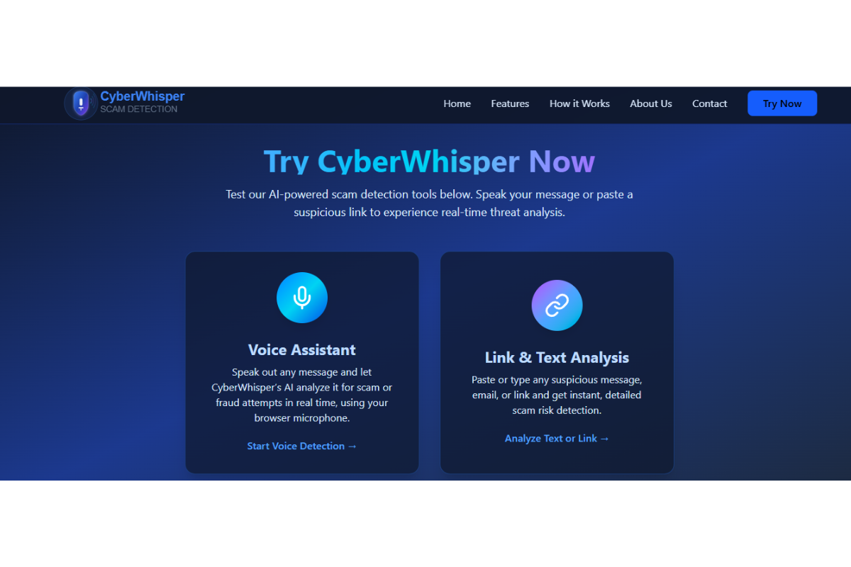 CyberWhisper is a real-time scam and threat analyzer for URLs or message. Users can paste or speak any link or message, and instantly get feedback on its safety—powered by the VirusTotal API and our intelligent backend. The app supports both traditional link scanning and a voice assistant, making it quick and intuitive to check any link or message on the go.