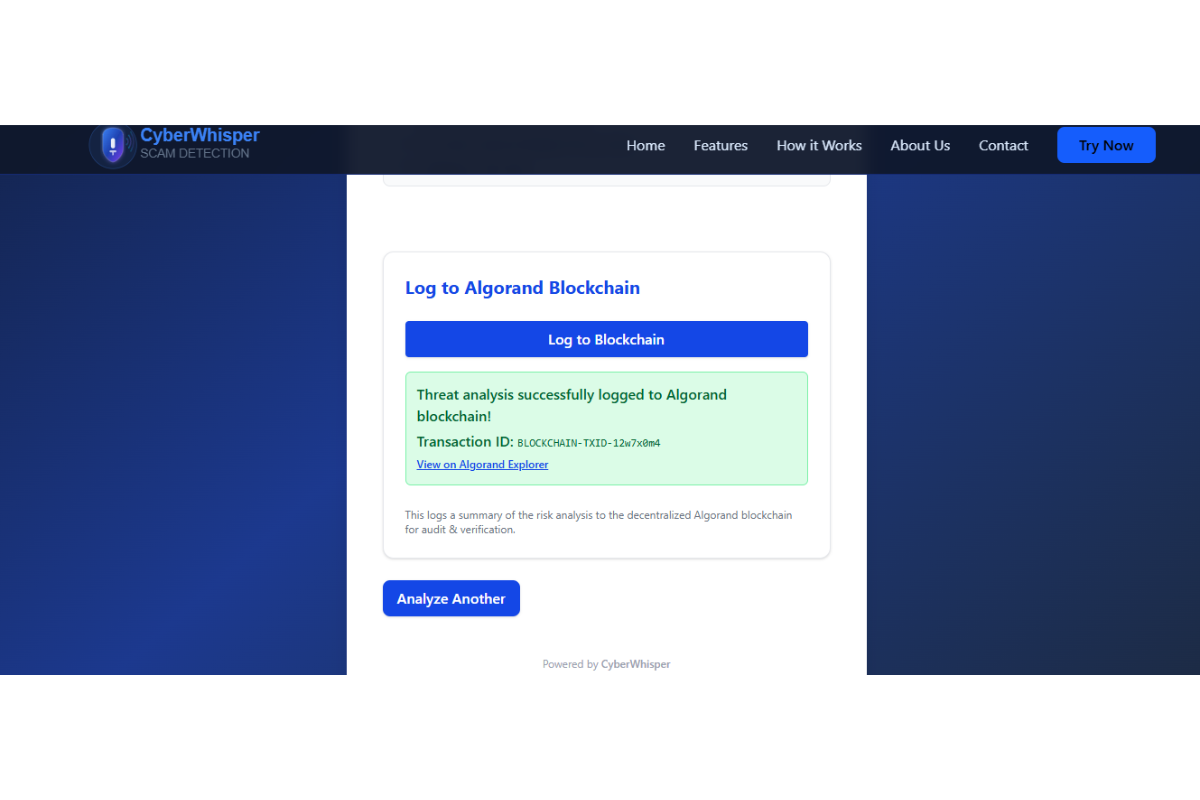 - My initial plan was to use the Algorand blockchain to store and verify link analysis results for added transparency. However, because of CORS issues and deployment limitations, we substituted the blockchain calls with a mock module that simulates the expected behavior.