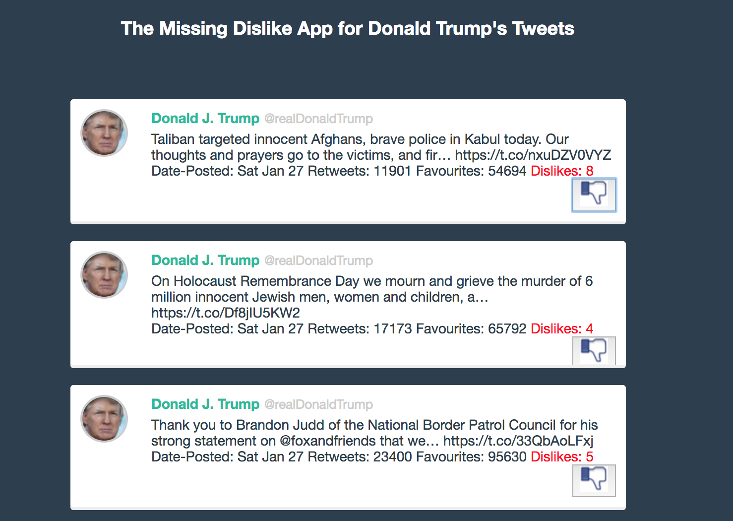 We show Trump's latest tweets and add a dislike button for them. You can now dislike his posts and everyone can dislike his posts together! Now we can see how many people dislike his tweets!