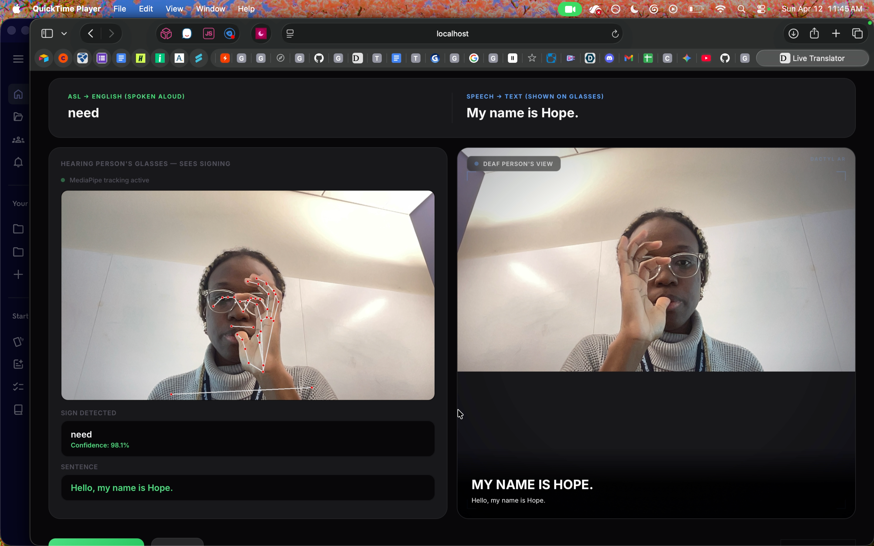 - Built a working bidirectional ASL translation glasses prototype from concept to demo.