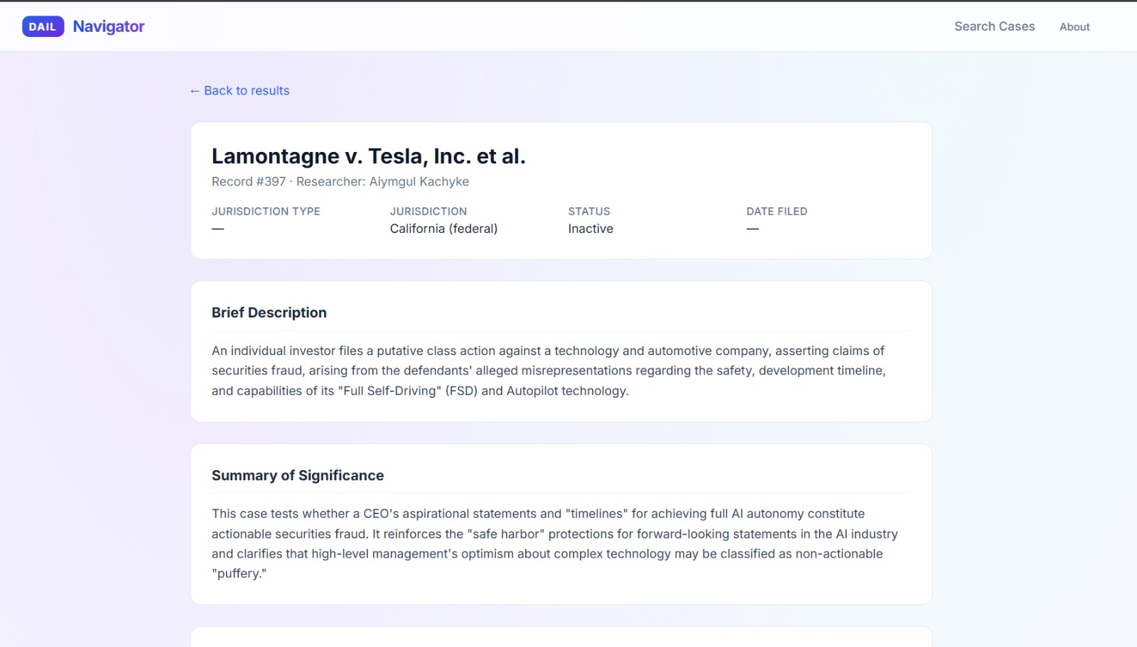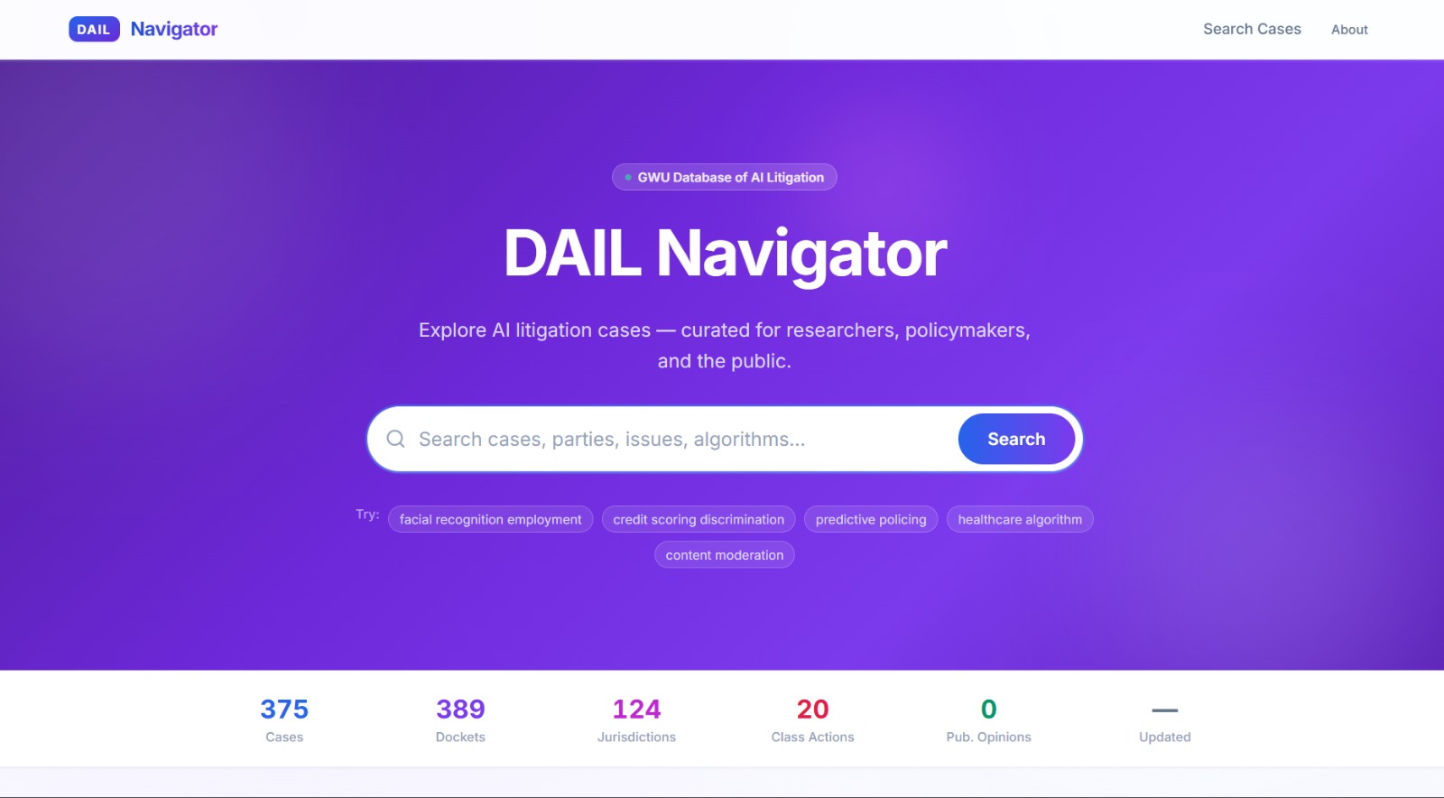 What it does DAIL Navigator is a full-stack search interface over the Database of AI Litigation. Users can free-text search across case captions, descriptions, parties, and keywords; apply faceted filters for jurisdiction, cause of action, issue type, and algorithm name; browse pre-built category jump-offs; and drill into full case detail pages with docket links. Every search is URL-shareable.