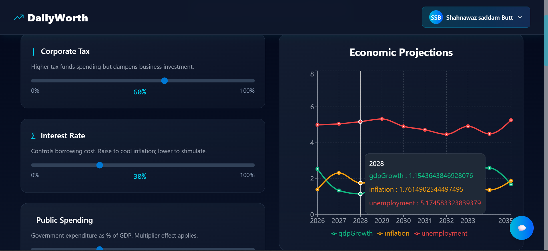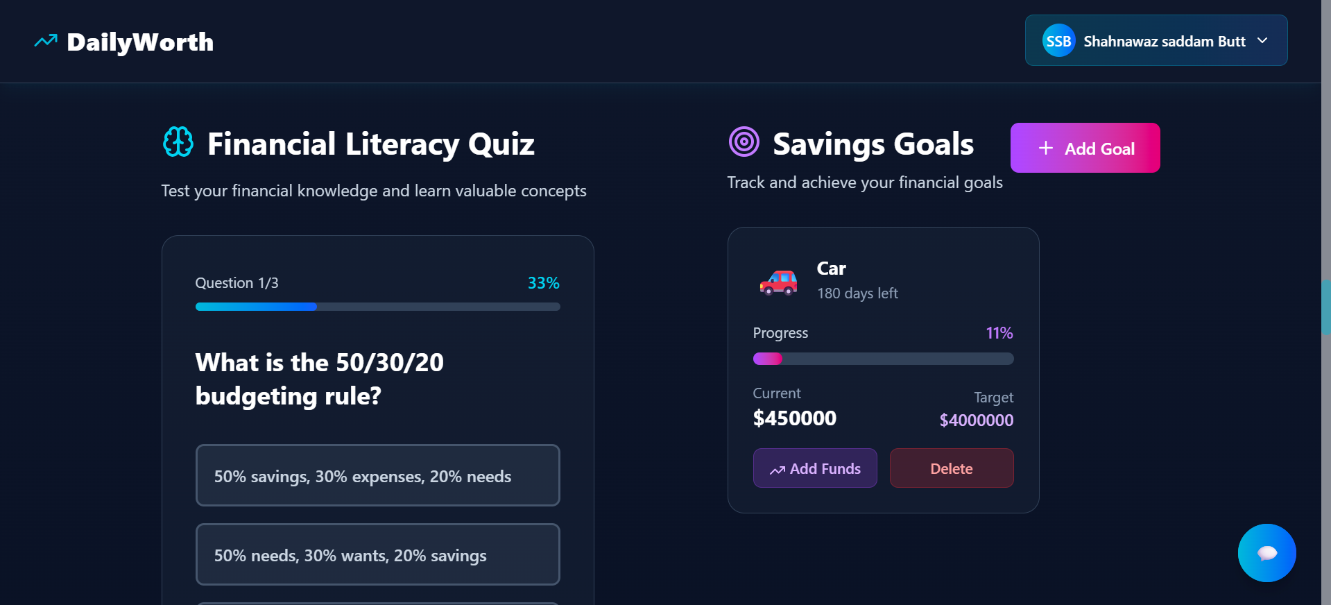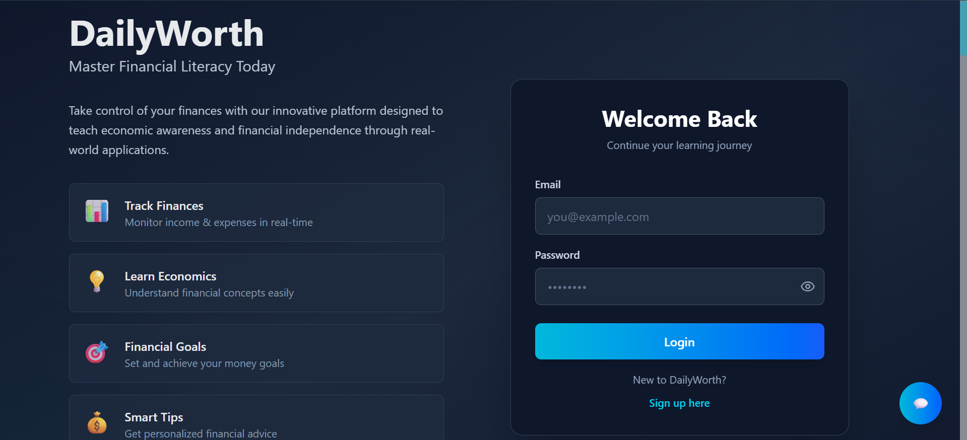 DailyWorth is an interactive financial literacy platform that combines real-world tools with simulation-based learning.
