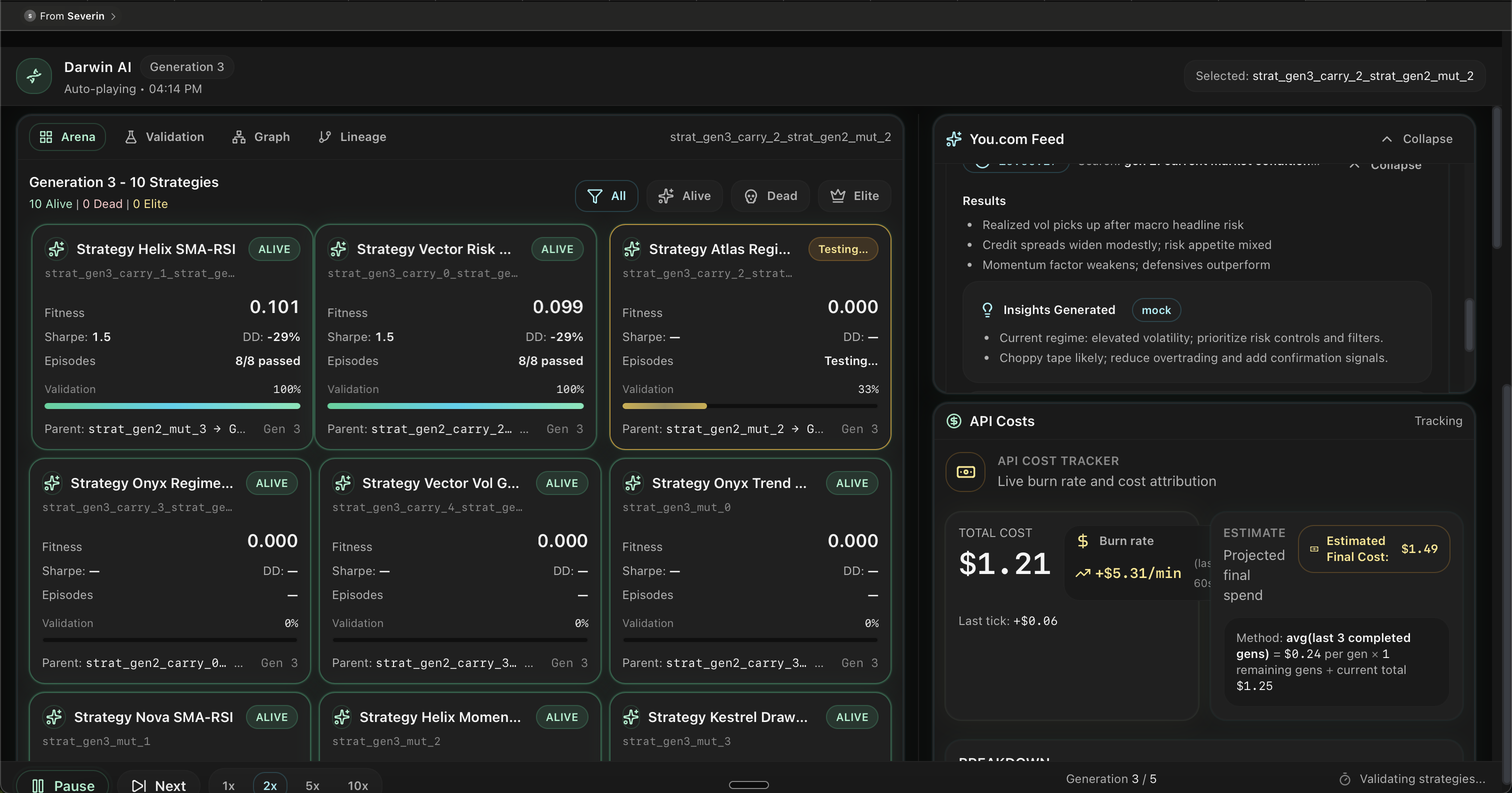 Generation 0: Random population (N=8 strategies) Selection: Kill failures (~50%), identify elite survivors Mutation: LLM-powered variations informed by You.com's real-time market research Repeat: 5-10 generations until champion emerges