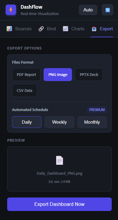 Automatically exports updated dashboards as PDF, PNG, or PowerPoint Scheduled distribution via email to stakeholder lists Posts to Slack channels when dashboards update Uploads to Google Drive or SharePoint folders Password-protected public links for external sharing