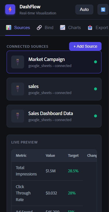 Integrates with Google Sheets, Salesforce, HubSpot, and custom REST APIs Secure OAuth authentication for all data sources Preview data before connecting to ensure accuracy Support for multiple simultaneous data connections