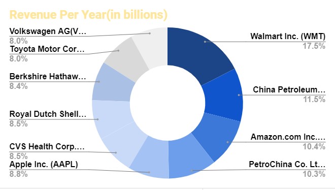 It presents the revenues generated by the top 10 companies in the world.