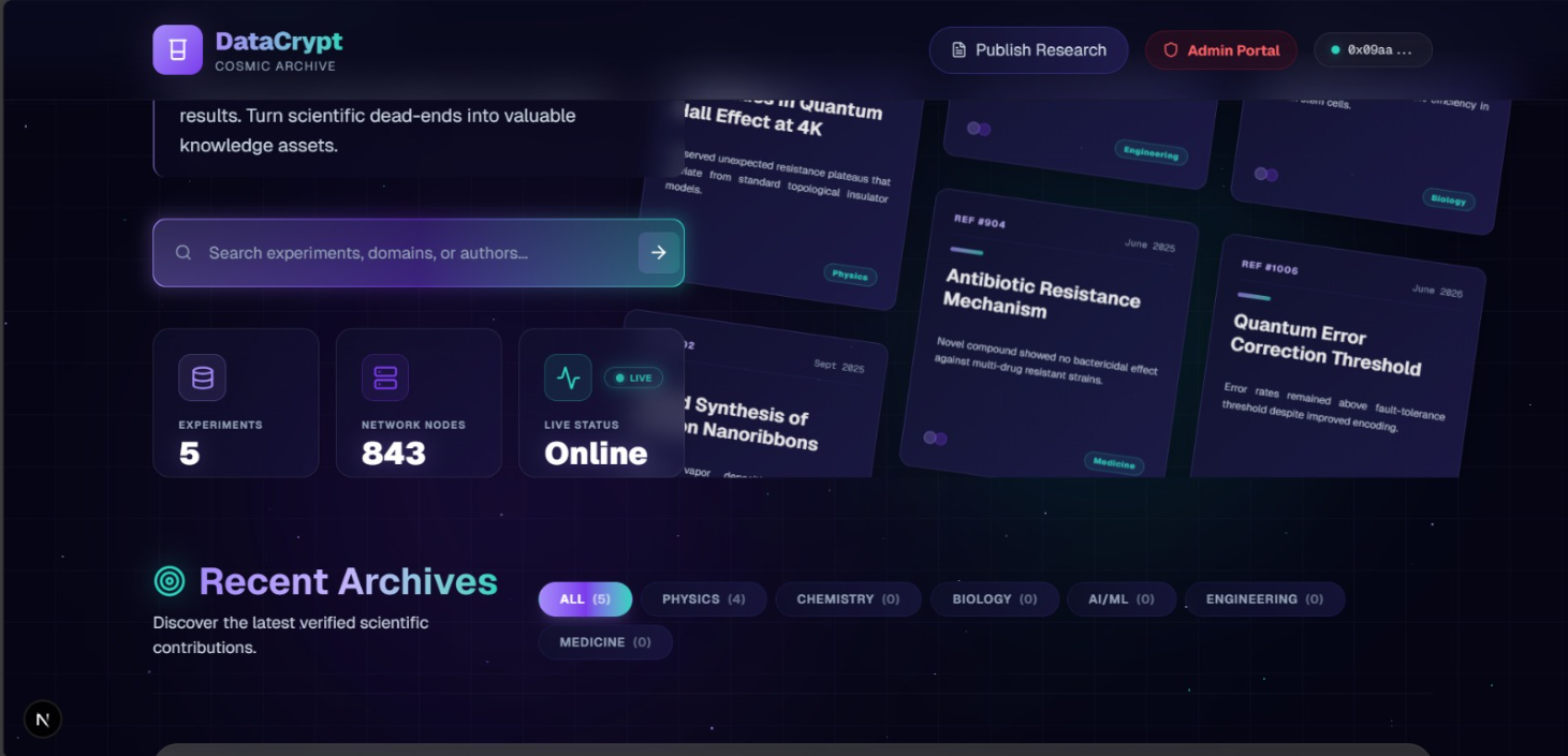 Explore DataCrypt: The Cosmic Archive turning scientific dead-ends into assets. Browse verified experiments and live network stats
