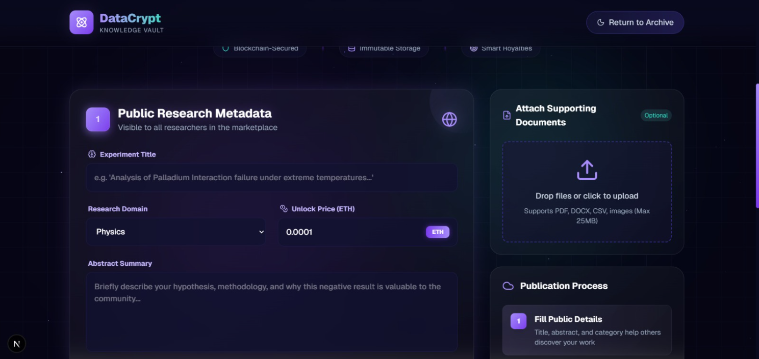 Set the Stage: Input public metadata, select your domain, and set an ETH unlock price for your research.