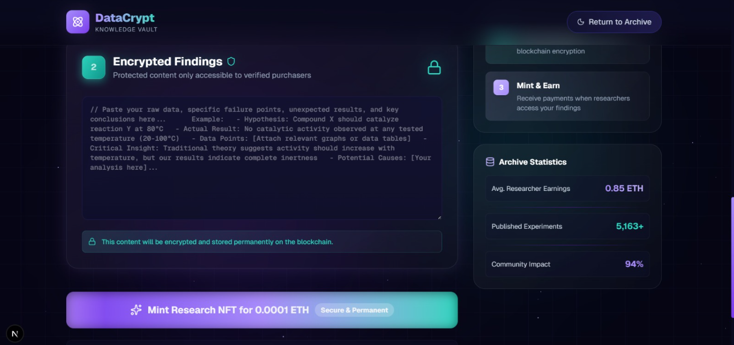 Mint & Earn: Encrypt raw findings, mint a permanent Research NFT, and earn ETH whenever peers access your data.
