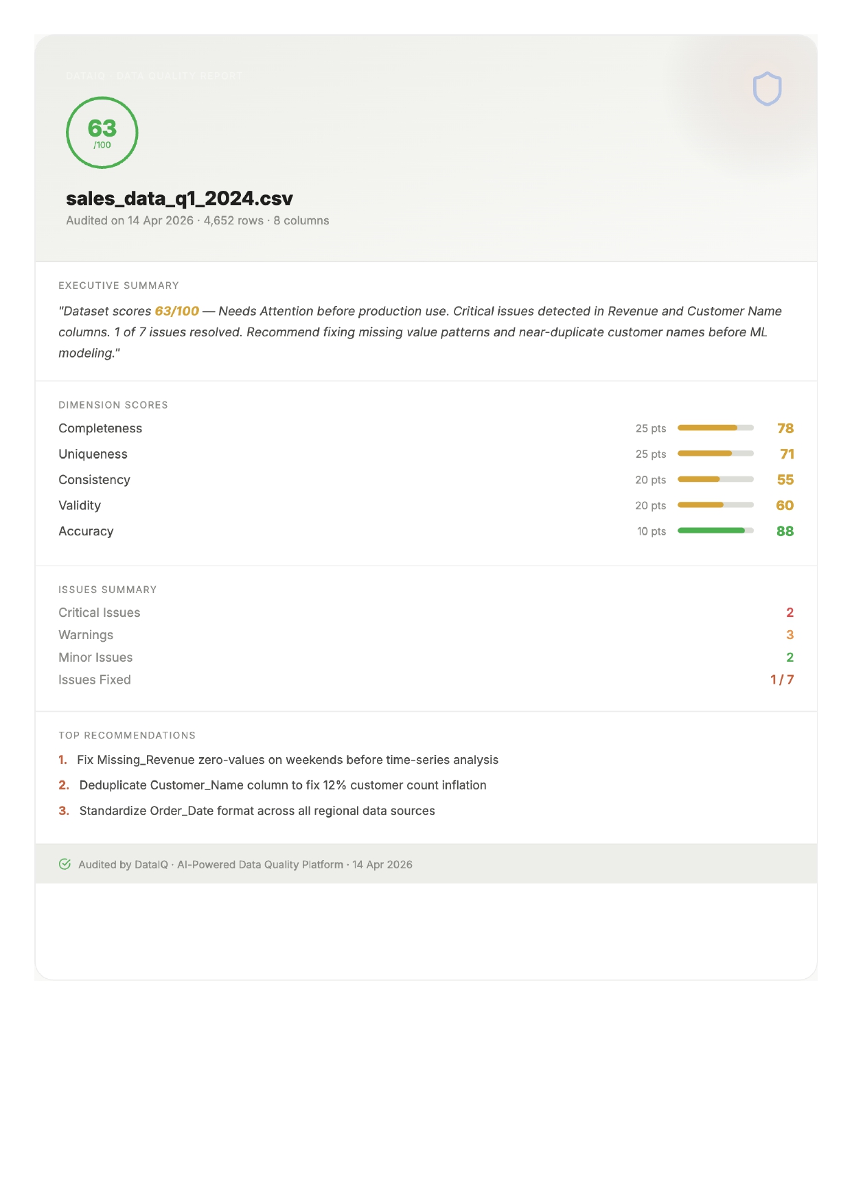 | 📊 Data Quality Score | Get a clear score (0–100) representing dataset health |