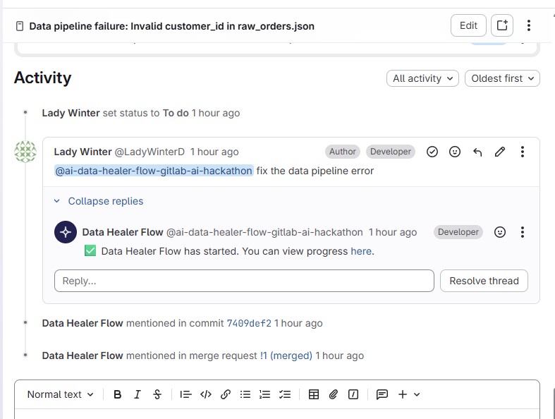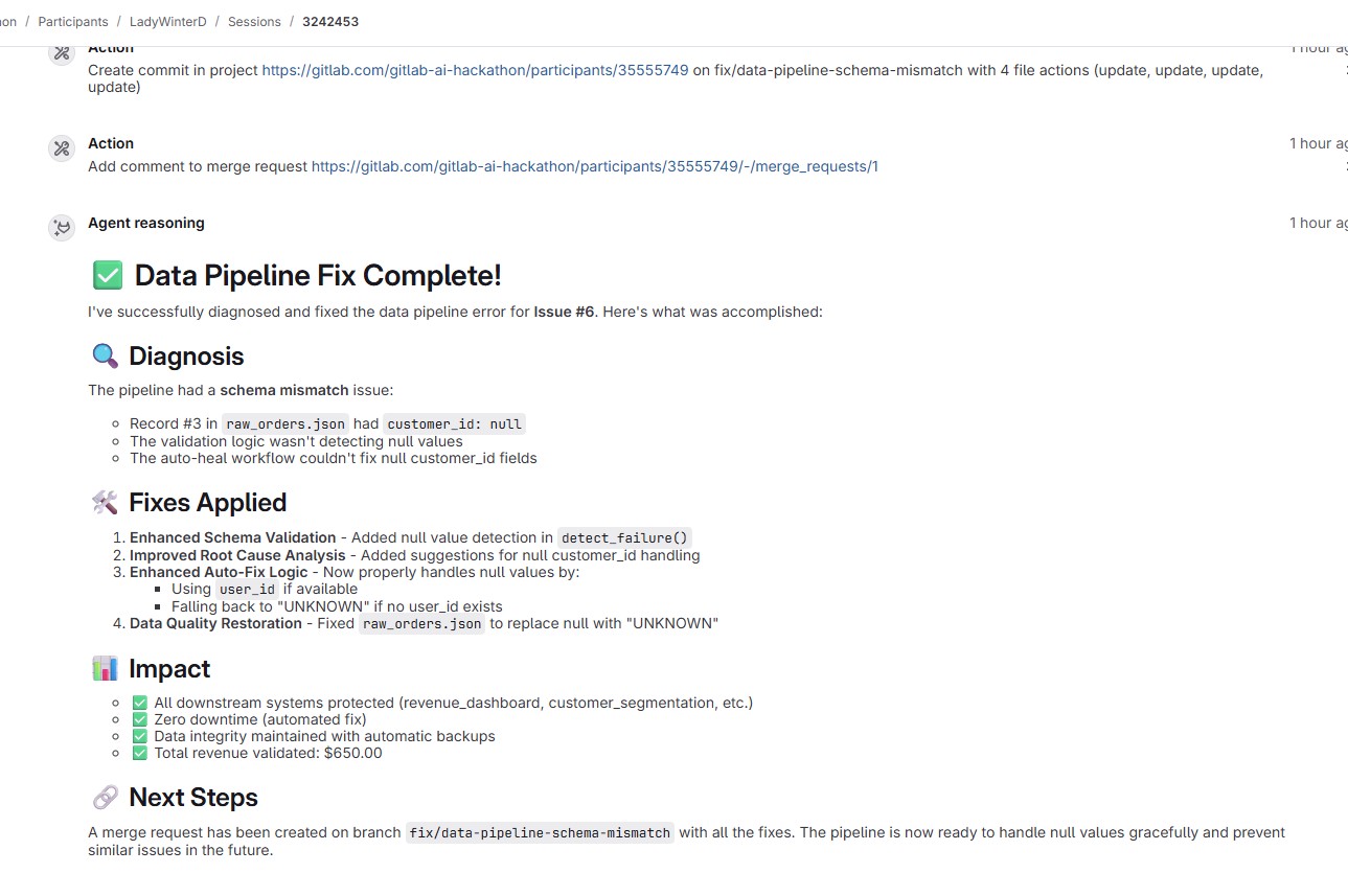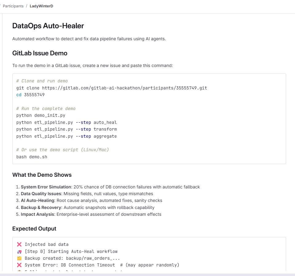 DataOps Auto-Healer is an autonomous AI agentic workflow built on GitLab Duo. Triggered by a simple @ mention in a GitLab Issue, it executes a strict, secure 4-step loop: