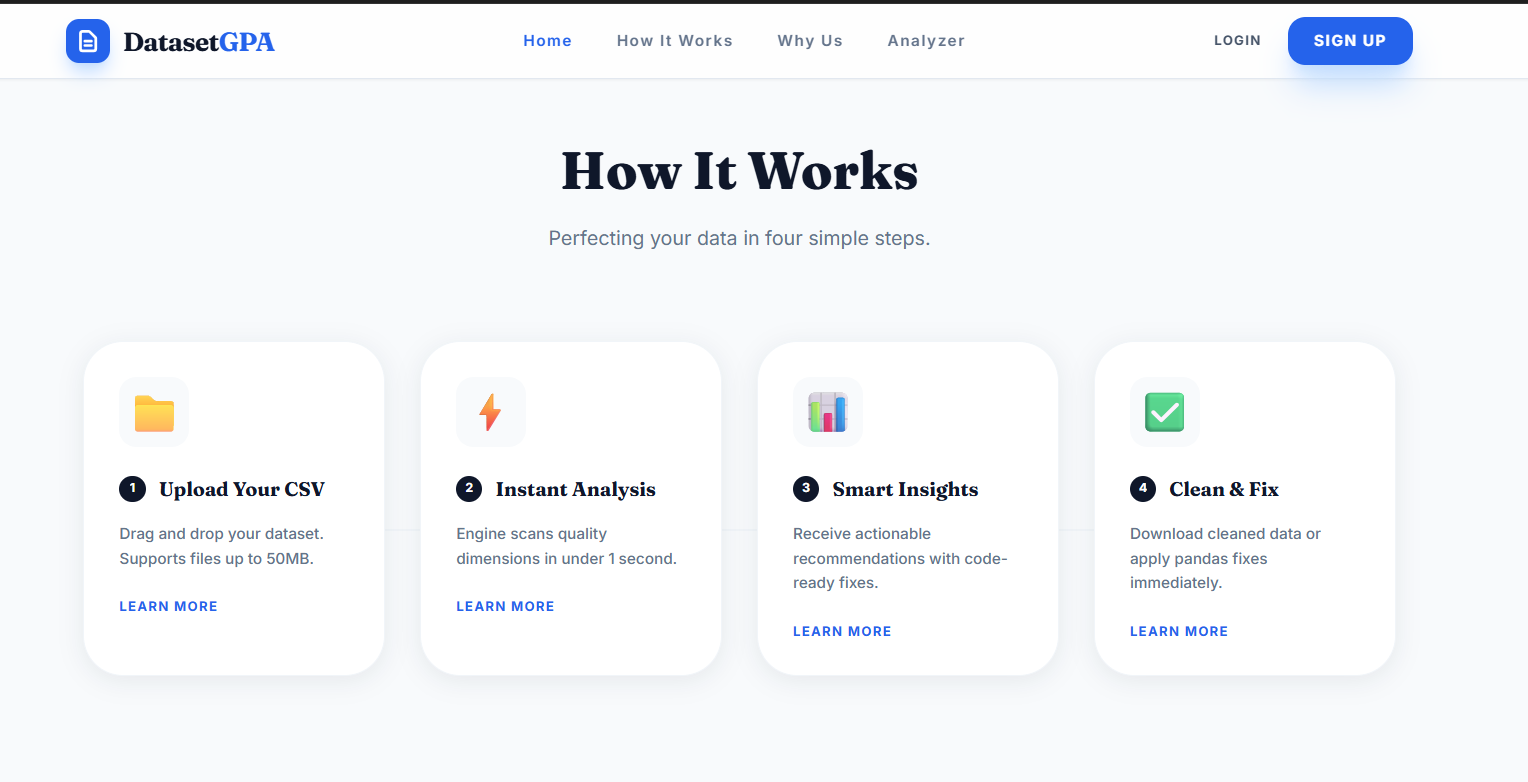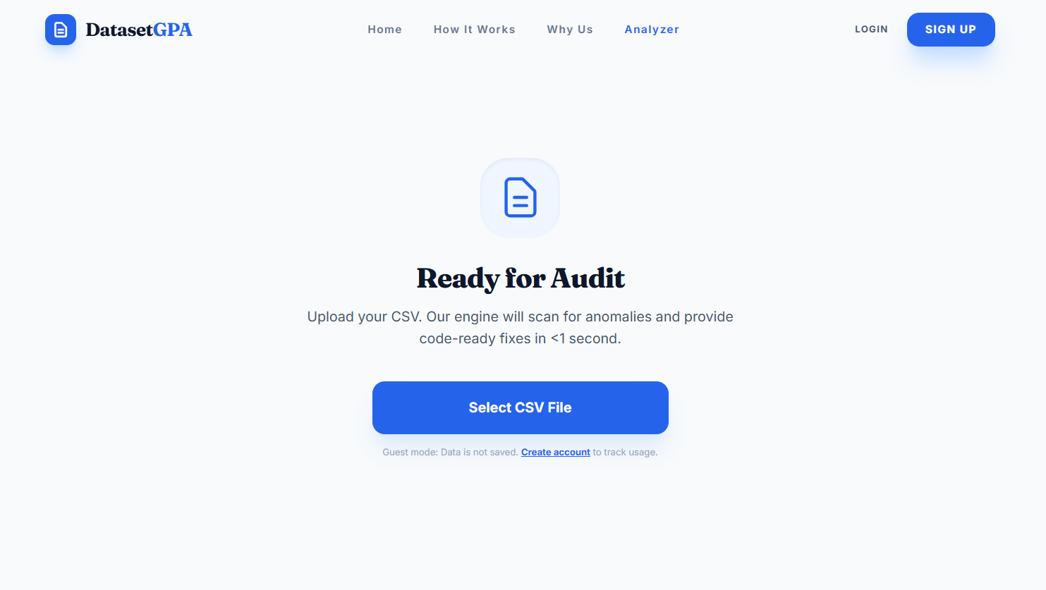 DatasetGPA is a browser-based tool that instantly analyzes your CSV datasets and tells you exactly what's wrong - before you waste time training. It detects: