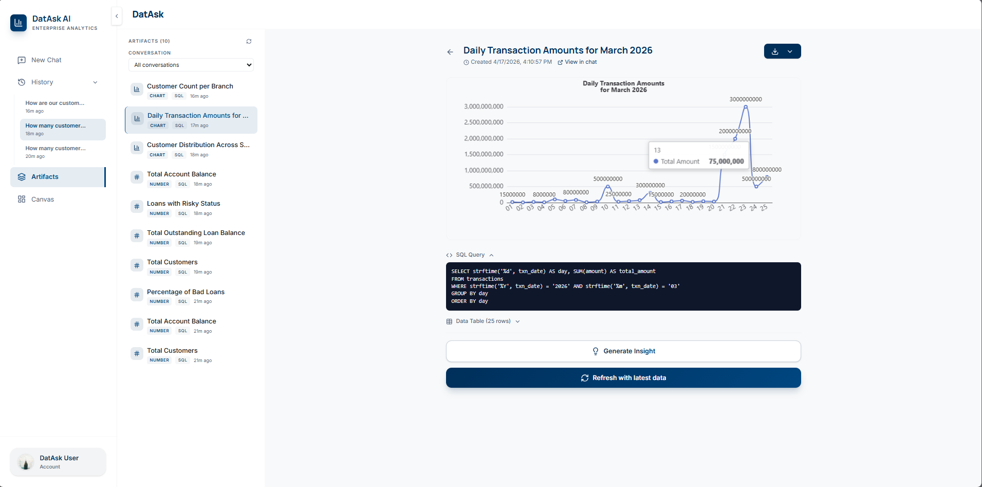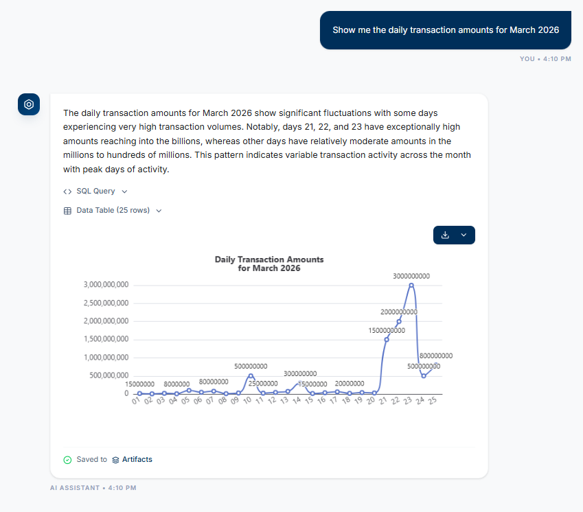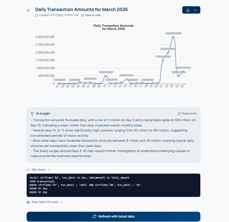 Banks cannot ship answers to executives when the reasoning is hidden. "Trust me, the AI said so" is not an audit trail. We solved this by making every intermediate artifact — the generated SQL, the raw row-level data, the chart, and the AI insight — visible and labeled. The user can audit any of them before sharing.
