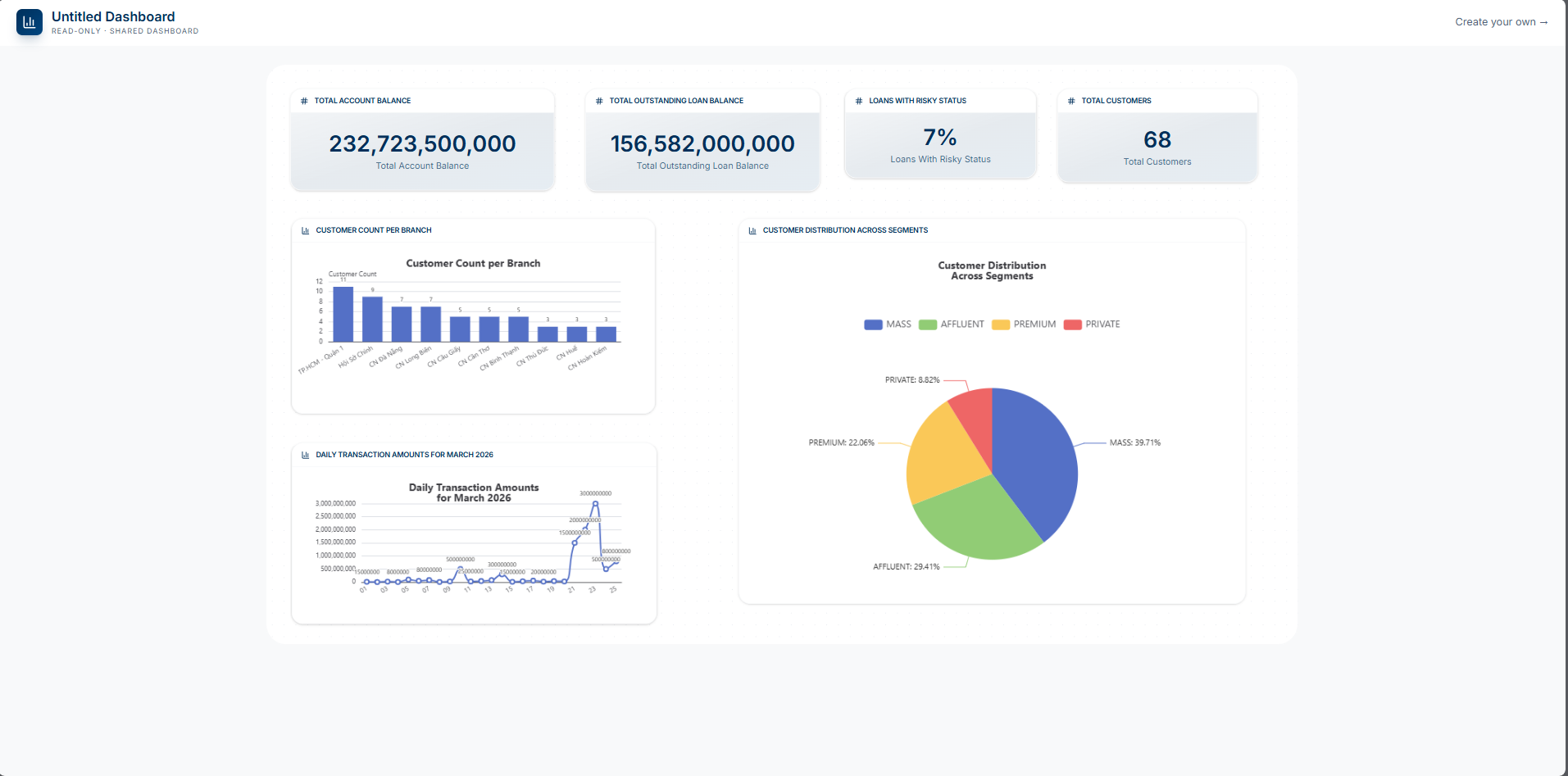 - Inspects the connected schema (customers, transactions, branches, products)