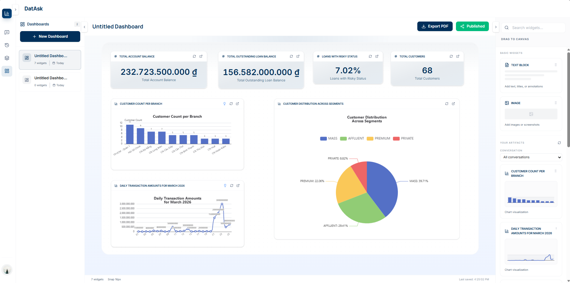 The user can then drag the artifact onto the Dashboard Canvas next to other saved answers, resize widgets, hit Publish, and send a link. From "I have a question" to "my team has a live dashboard" — under 5 minutes.