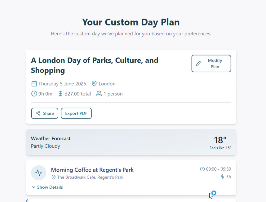 Thanks to the excitement I had foe this project, I was able to go from idea to working product so quickly that I even had the confidence to approach strangers in London and ask them to test DayWeave during their actual trips. Seeing tourists get genuinely excited about using something I built – that's when I knew we had something special.