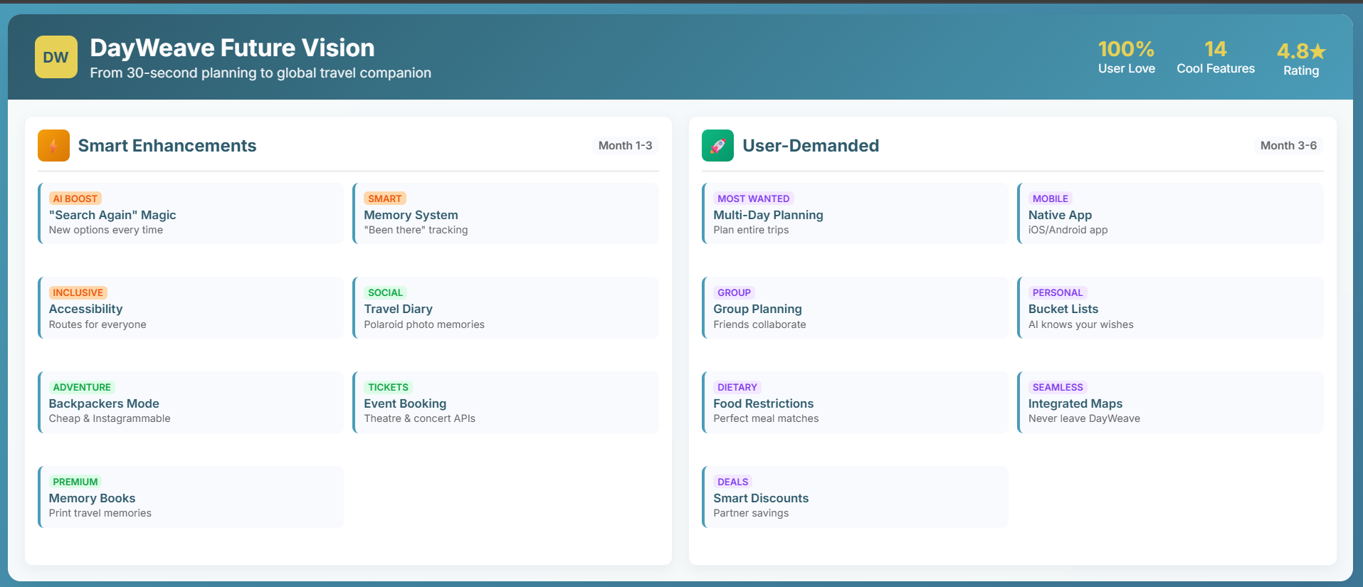 Growth Strategy: Reach 10,000+ users with 15% converting to paid plans. Day Weave already works globally – users are planning trips worldwide. Add multi-day trip planning capabilities. Launch B2B integrations with hotels, tourism boards, and travel agencies. Dual revenue stream through subscriptions and affiliate commissions.
