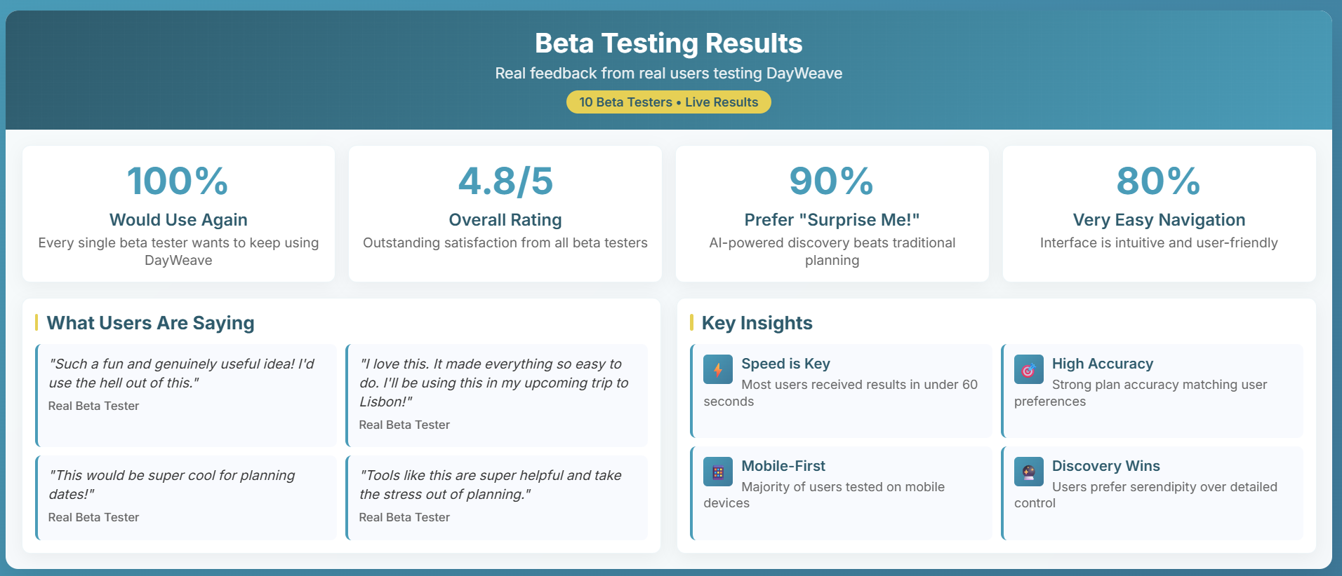 User Feedback Results: Based on beta testing with real users: