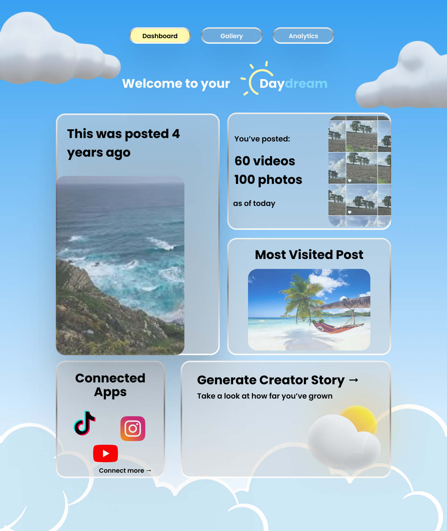 Daydream is a centralized creator dashboard that makes looking back feel as natural as creating. When users open it, they are immediately met with a dashboard screen which displays unique creator journey data in a grid, e.g. memories. Users are also able to view all of their posts across all platforms and view analytics for better future performance.