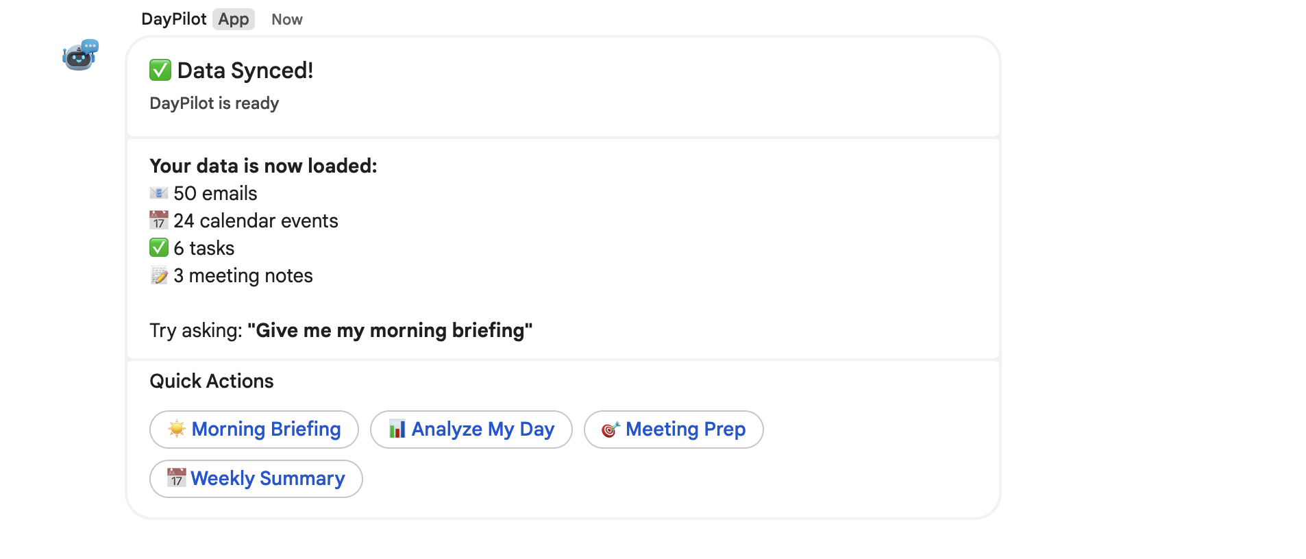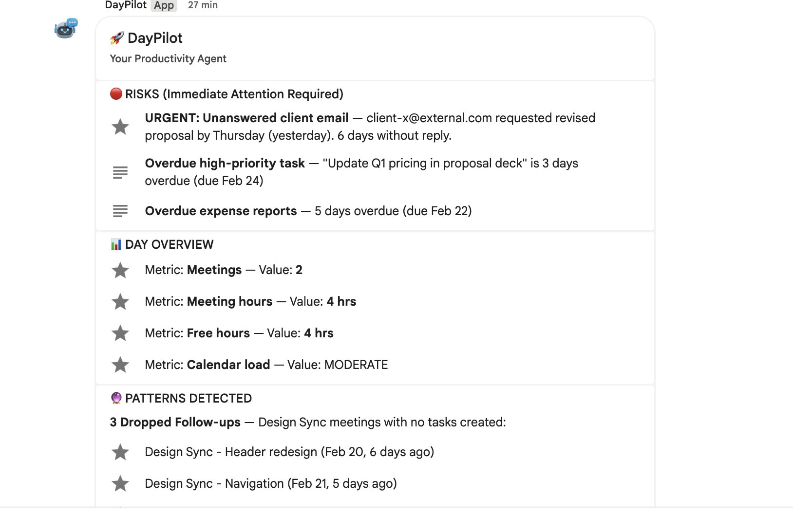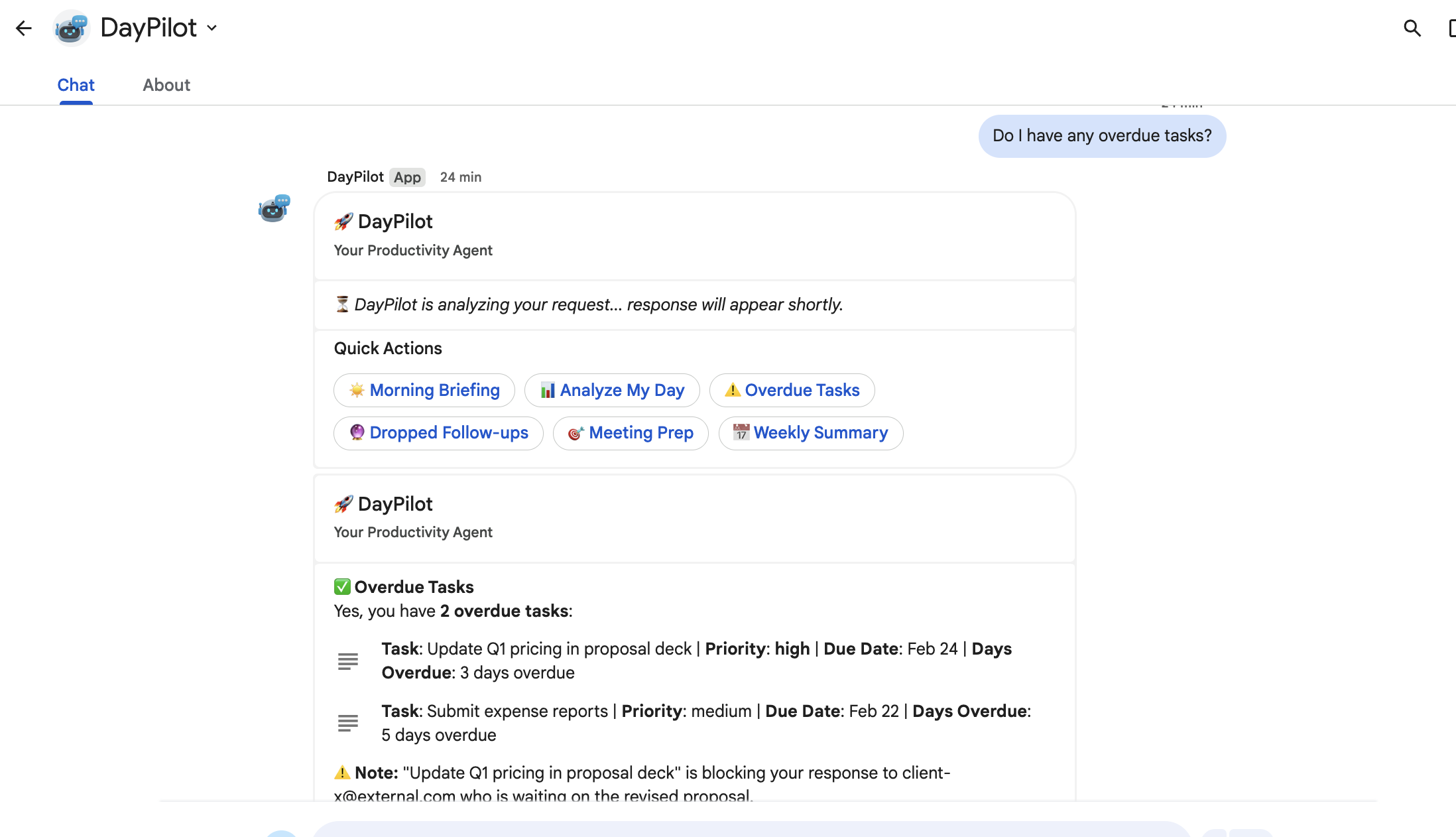 The experience is fully interactive: 6 one-click quick action buttons (Morning Briefing, Analyze Day, Overdue Tasks, Dropped Follow-ups, Meeting Prep, Weekly Summary), 4 slash commands (/briefing, /tasks, /followups, /help), and a "Create Tasks" button that writes tasks directly into Google tasks when dropped follow-ups are detected. Every morning at 8 AM, DayPilot automatically sends you a full briefing — and every evening at 6 PM, an end-of-day wrap-up — powered by Cloud Scheduler. You don't even need to ask.