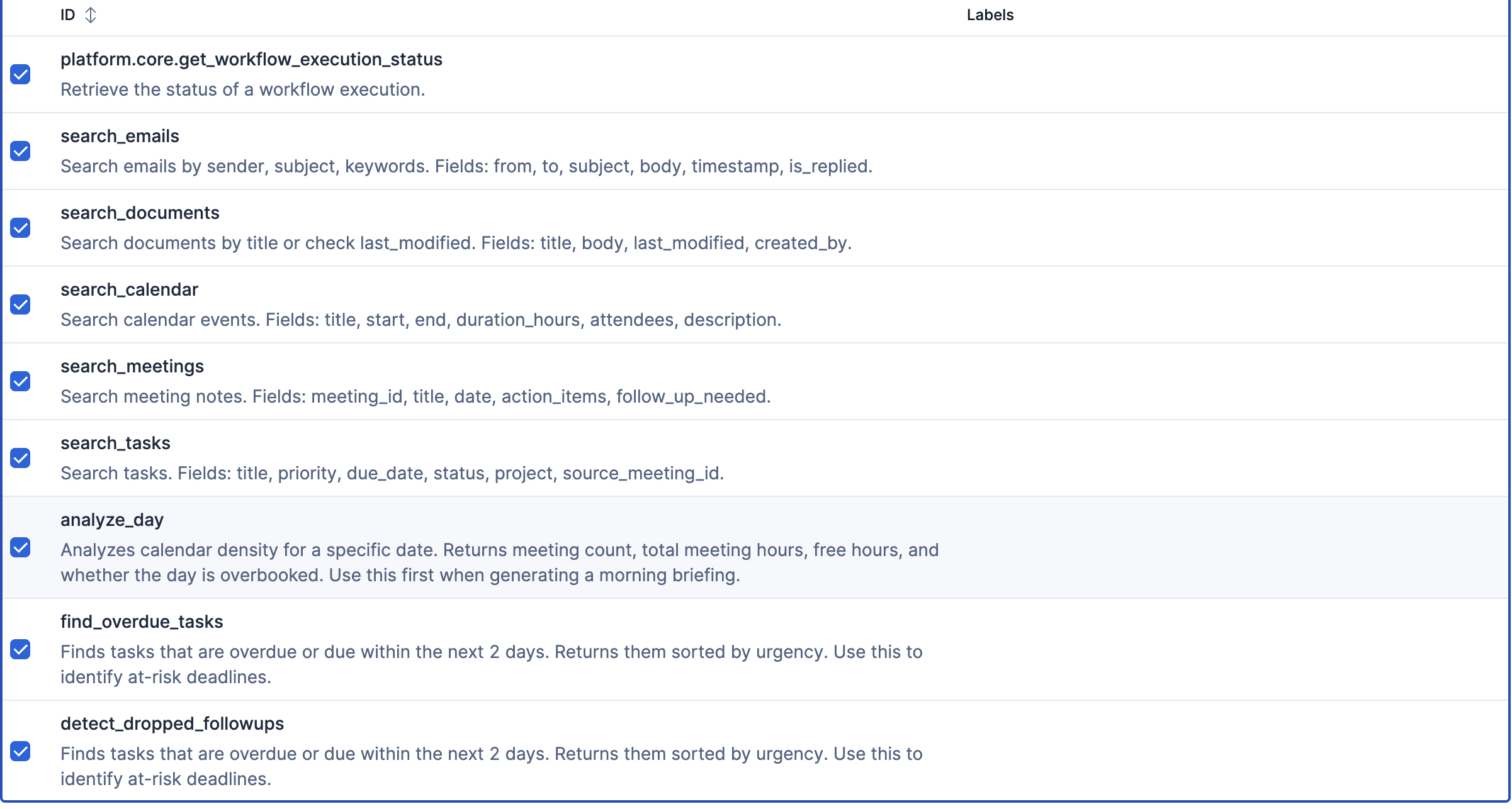 WHERE due_date < NOW() AND status != 'completed'), detecting unanswered emails, and cross-referencing meeting action items against the task database. - Multi-tool chaining: A morning briefing chains 5+ tools — querying today's calendar, cross-referencing attendees' emails, checking overdue tasks, scanning meeting notes for dropped follow-ups, and synthesizing a prioritized action plan.