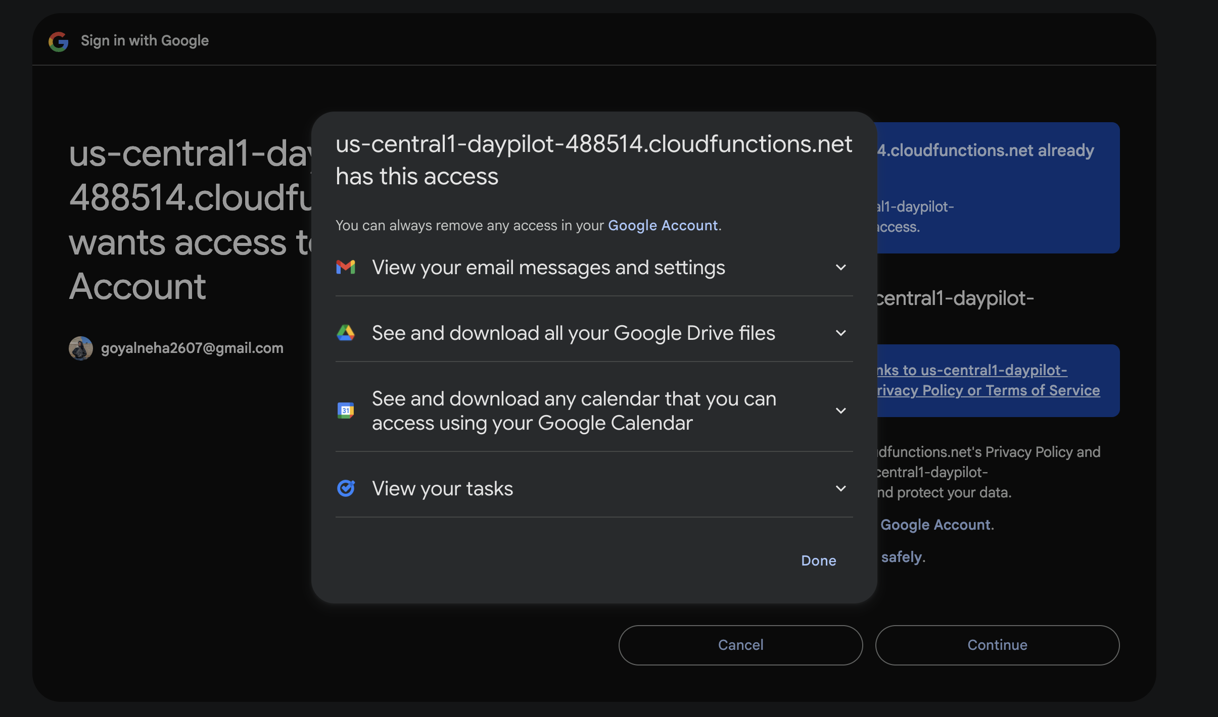 - One-Click OAuth Onboarding — Add DayPilot to Google Chat and it immediately prompts you to connect your Google account. Your Gmail, Calendar, Tasks, and Drive data are ingested into Elasticsearch automatically — zero setup.