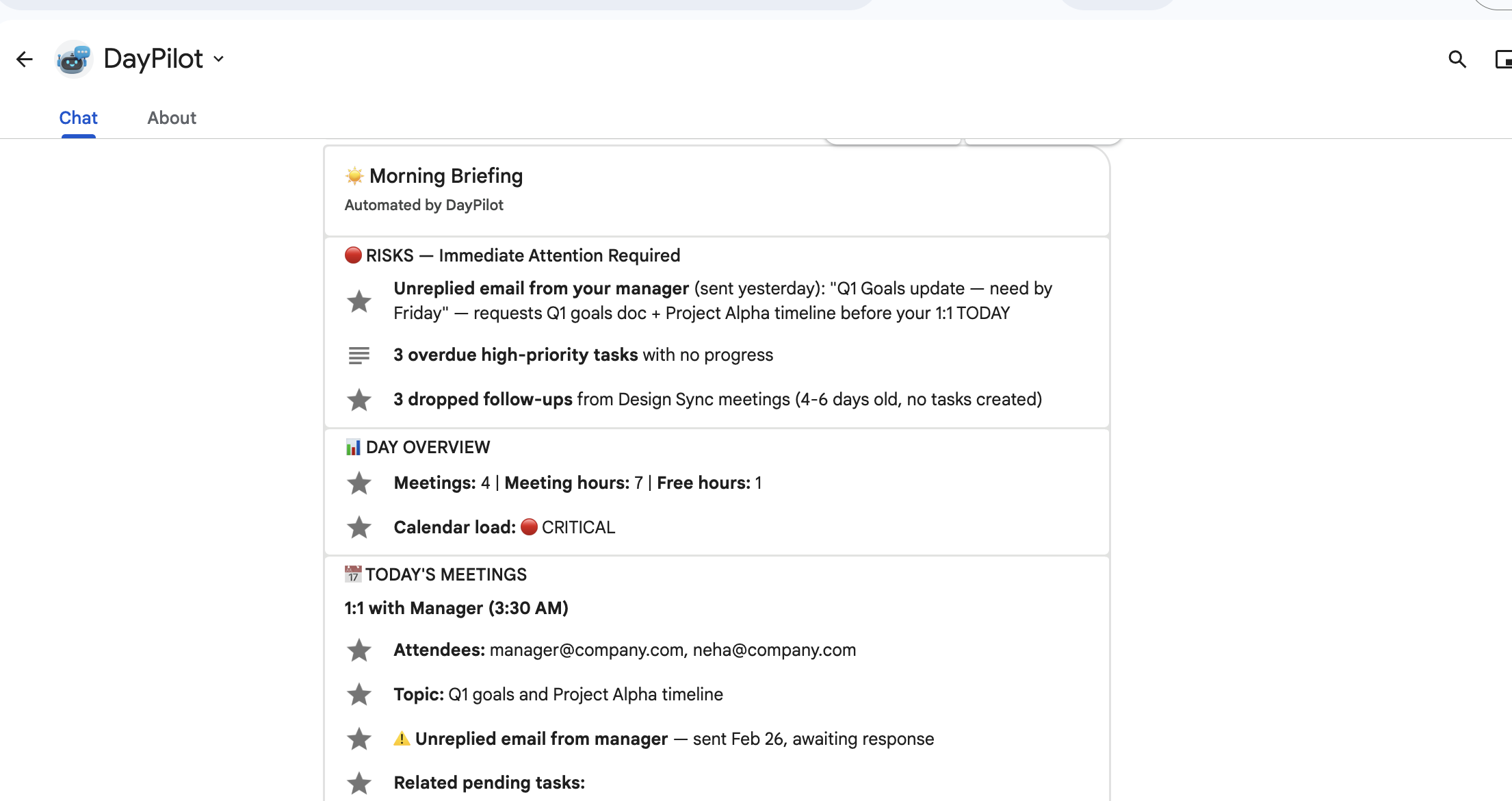 DayPilot is an autonomous AI agent that lives inside Google Chat. With a single message — "Give me my morning briefing" — it autonomously cross-references your Google Calendar events, Gmail inbox, Google Tasks, and Drive meeting notes to deliver a personalized productivity brief. It surfaces overdue tasks, detects dropped follow-ups from past meetings, flags unanswered emails tied to upcoming appointments, and identifies patterns like systematic follow-up failures across consecutive meetings.