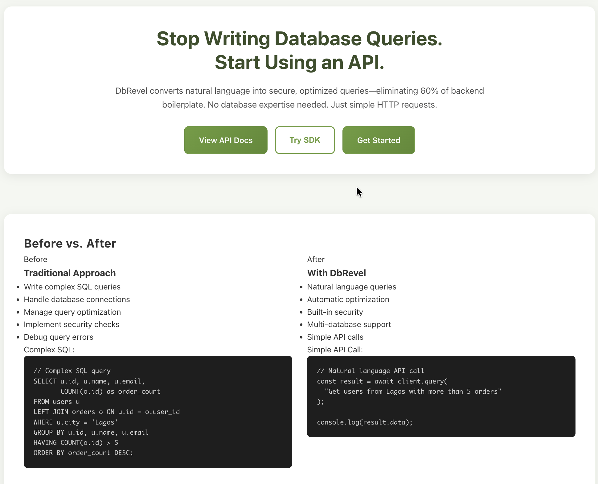 The vision is to create a wrapper that finally brings a true "backendless" reality to deployments. In the same way that Cursor acts as a wrapper for VS Code and Vercel wraps AWS, DbRevel aims to be the definitive wrapper for the backend.