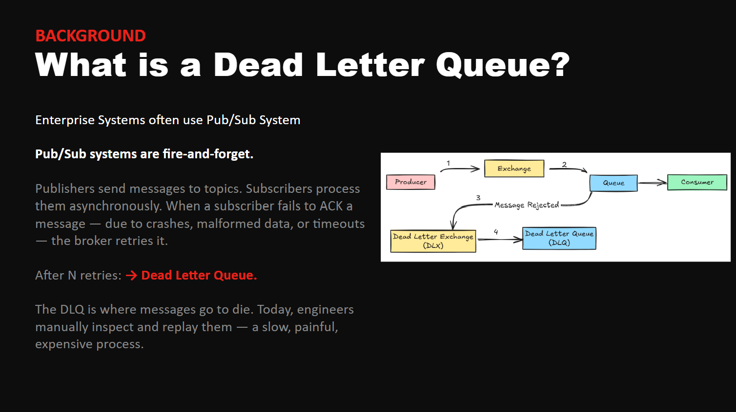 Currently, the DLQ is a graveyard where data goes to die. Engineers have to manually inspect failed messages, dig through logs, and replay them by hand - a slow, expensive process that kills productivity.