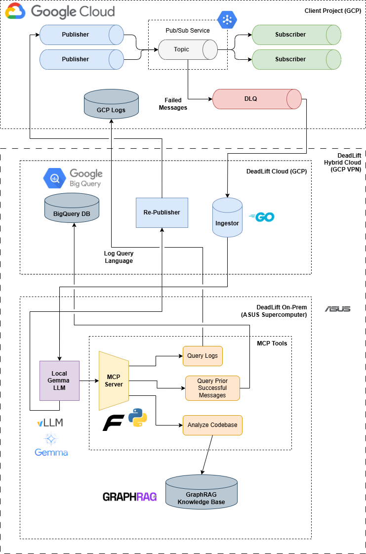We built DeadLift on a hybrid architecture: Cloud Run microservices on GCP handle ingestion, context aggregation, and orchestration, acting as a proxy to a locally hosted Gemma model served with vLLM, keeping inference on-prem for performance and security. GraphRAG indexes are also maintained locally as user-partitioned knowledge bases, while BigQuery stores historical message context and Firebase manages real-time state. Our dashboard integrates with GCP Cloud Logging and a custom MCP server to give on-call engineers a human-in-the-loop approval flow, enabling a single-click republish of AI-fixed messages back to the original Pub/Sub topic.