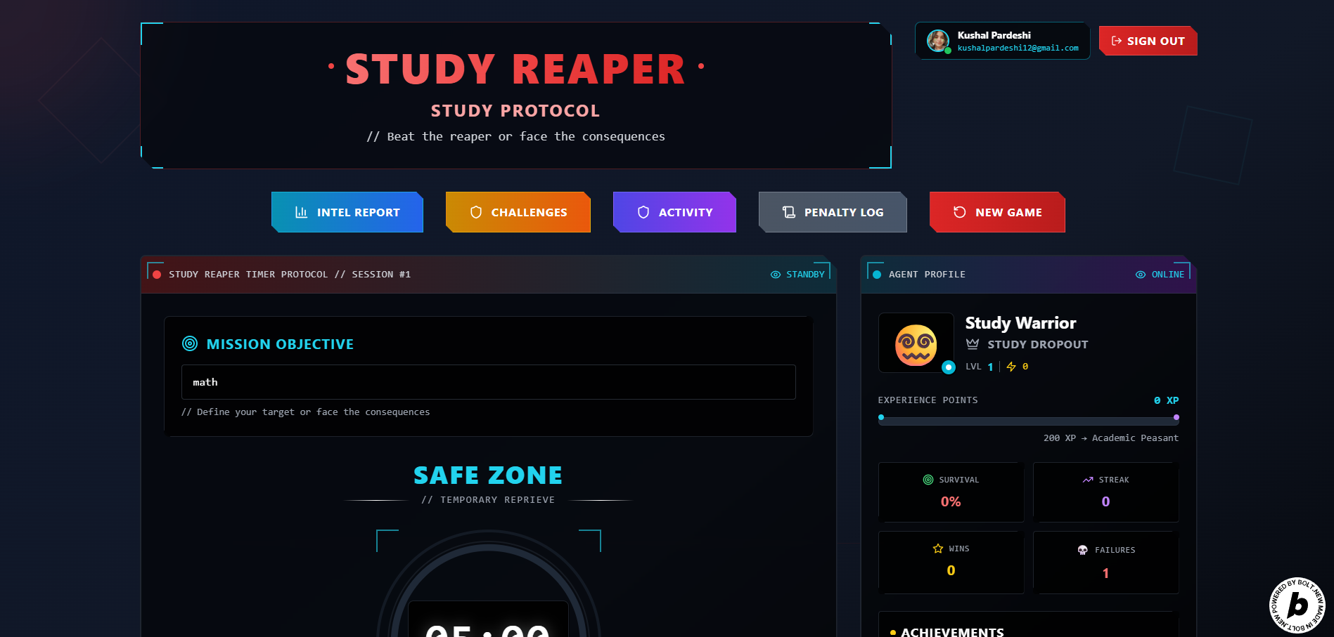 That's when I decided to build Study Reaper - an app that beats procrastination through the fear of embarrassment rather than empty motivation. I wanted to make studying feel like a high-stakes game where failure has real (but harmless) consequences.