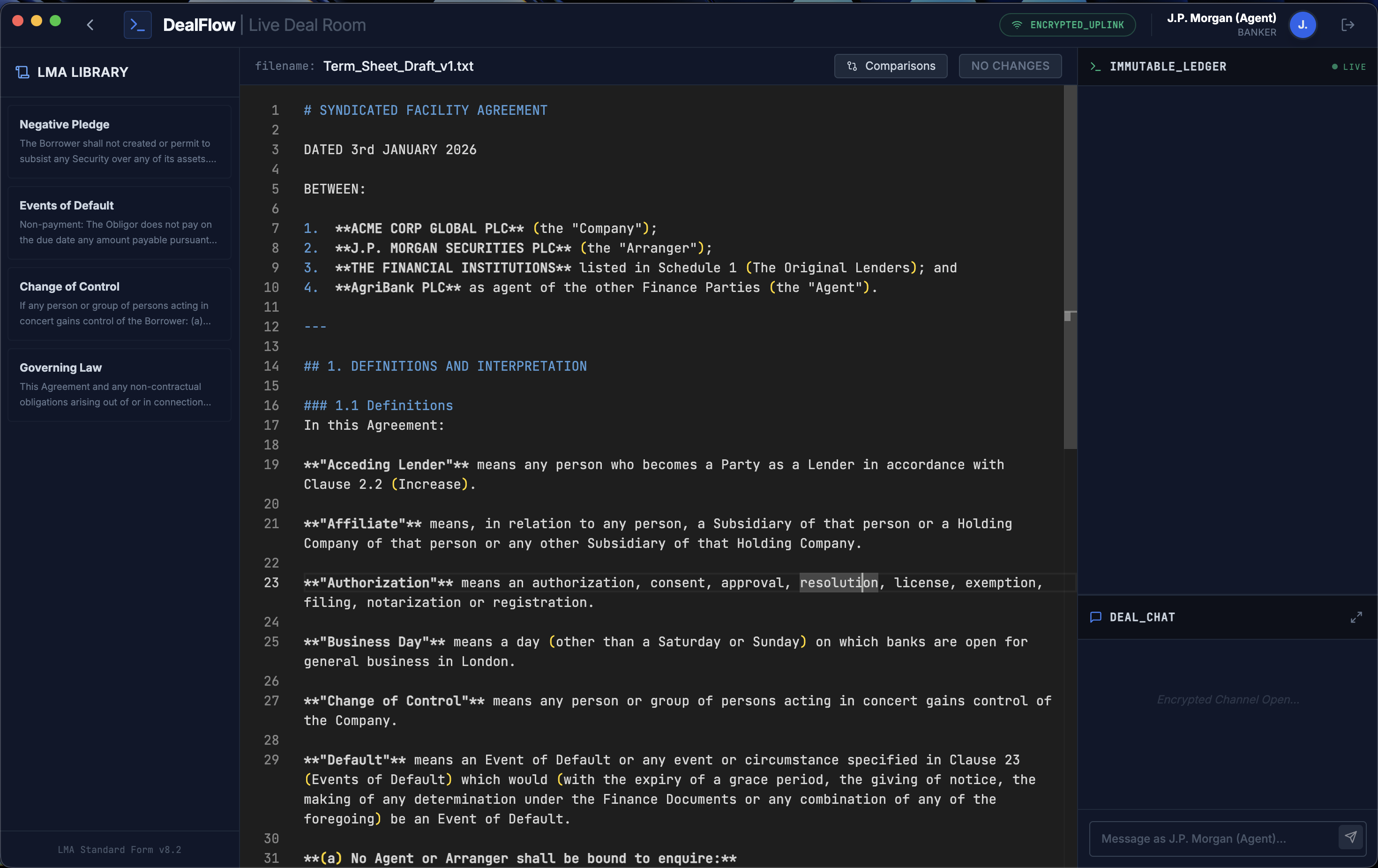 I was inspired by the mess of "email tag" that happens during high-stakes legal negotiations. In the syndicated loan market, document versions get lost in endless email threads constantly. I wanted to build something like a Bloomberg Terminal for legal drafting, replacing static Word files with a live environment where everything is transparent.