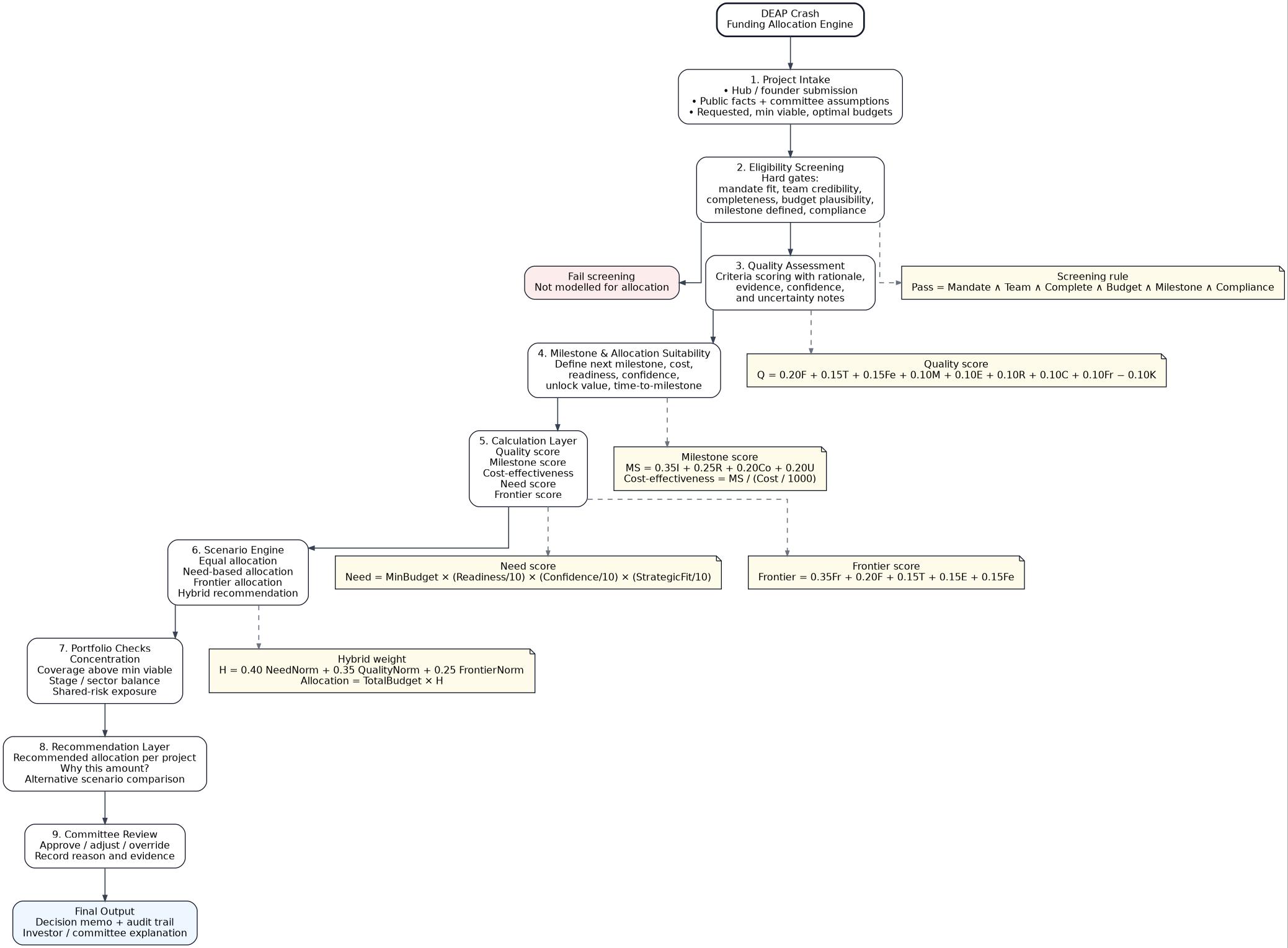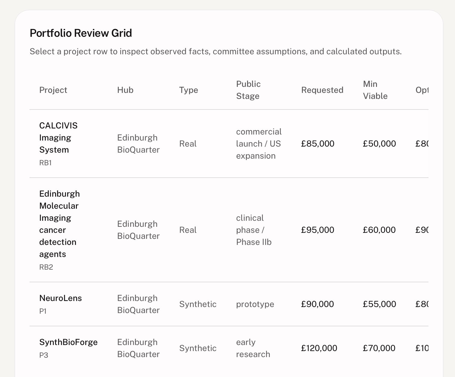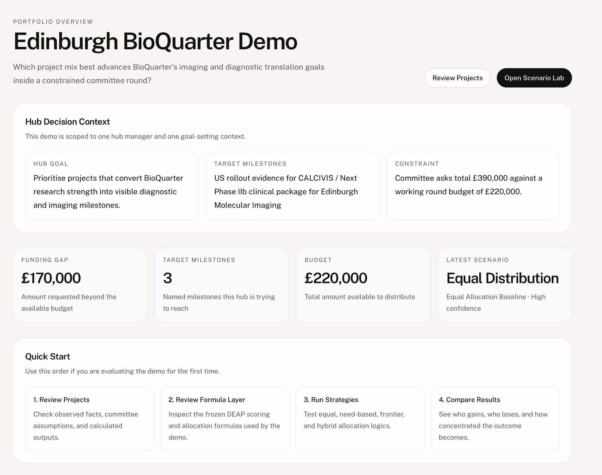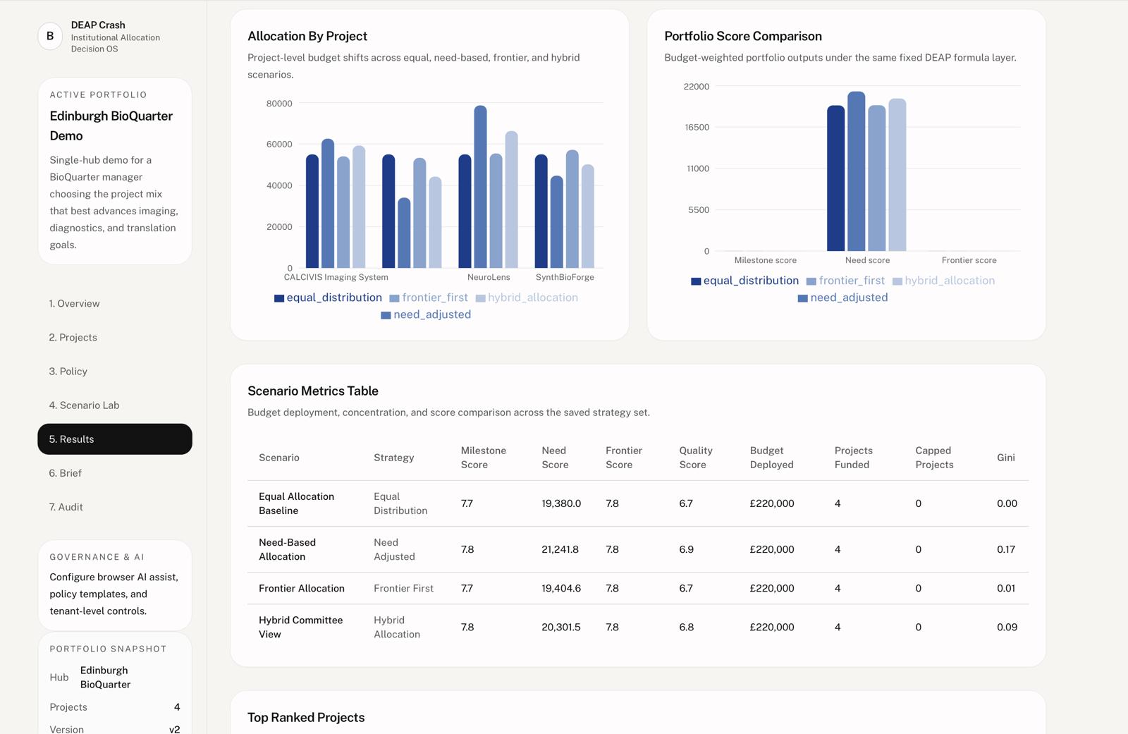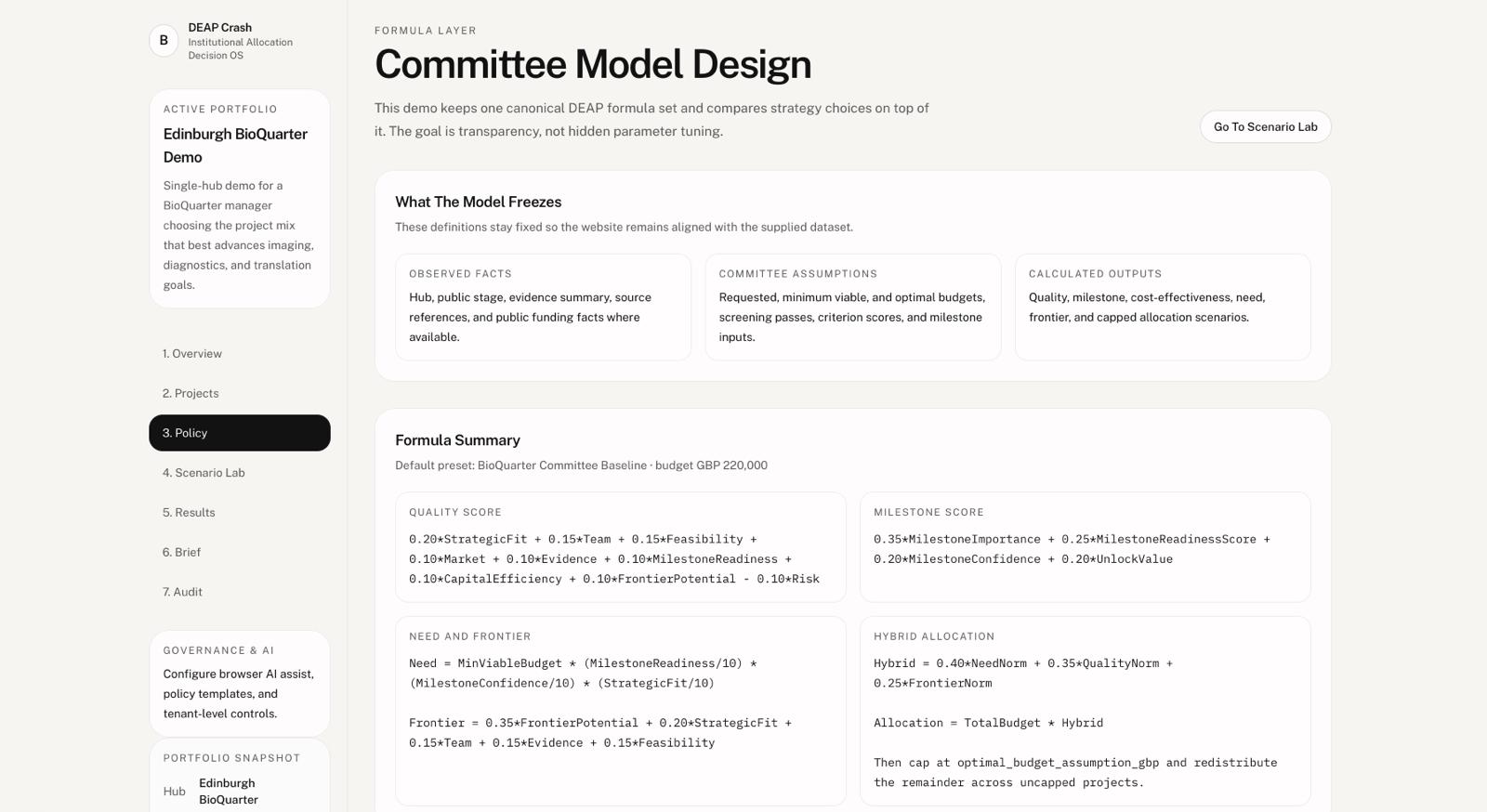 DEAP Crash is a decision-support platform for biomedical funding committees. It helps analysts evaluate portfolios by keeping three things clearly separate: sourced public facts, committee assumptions, and model outputs. That means teams can run allocation scenarios across projects, compare trade-offs under constrained budgets, and generate committee-ready briefs without blurring evidence and guesswork.