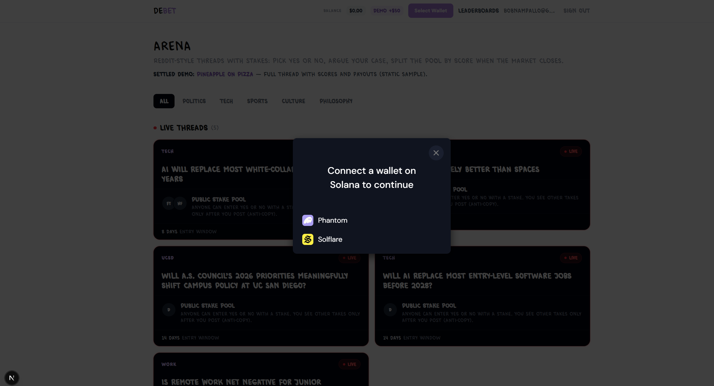 We want to introduce real money payouts through Solana that’s why we added the wallet connect to basically hint at it, pull in live news topics automatically so the platform stays current, and build a reputation system so the best arguers build a track record over time. Long term, DeBet could become a new kind of signal layer where cultural conviction is actually quantifiable and tradable.