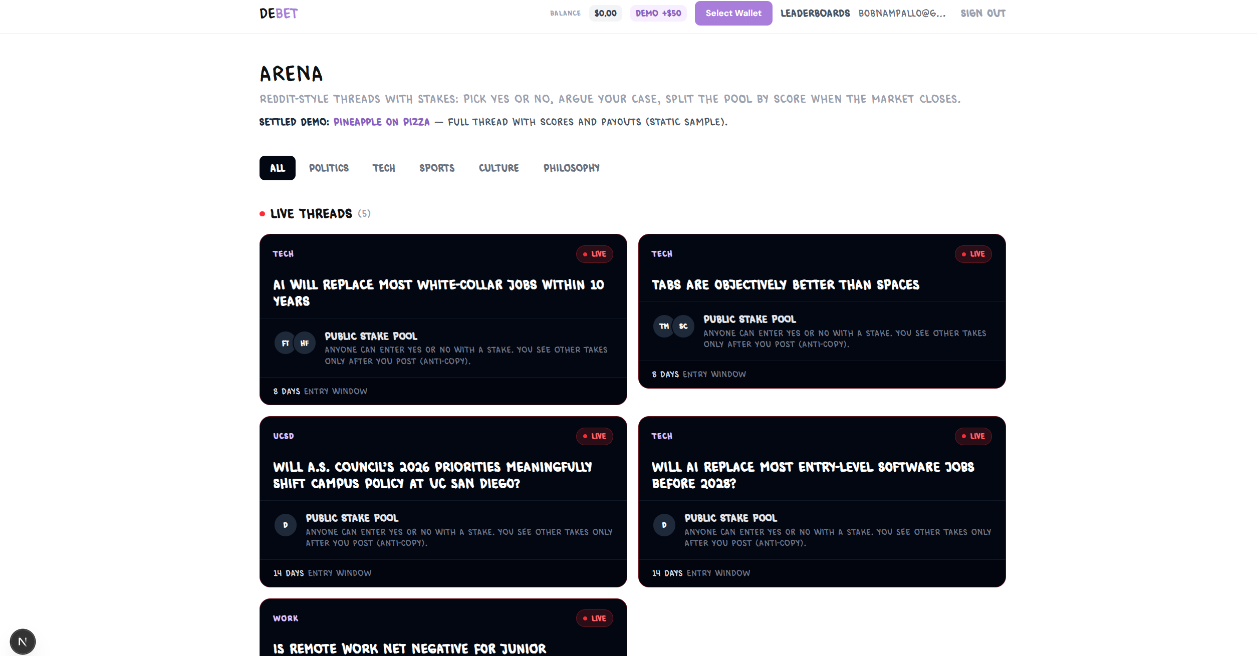 We've all been in an argument where someone says "I'd bet money on it" and then nothing happens. That throwaway phrase stuck with us. What if you actually could? Not just on outcomes, but on the quality of your reasoning? We wanted to build something that rewards people for thinking well, not just thinking loudly. That's where DeBet came from.