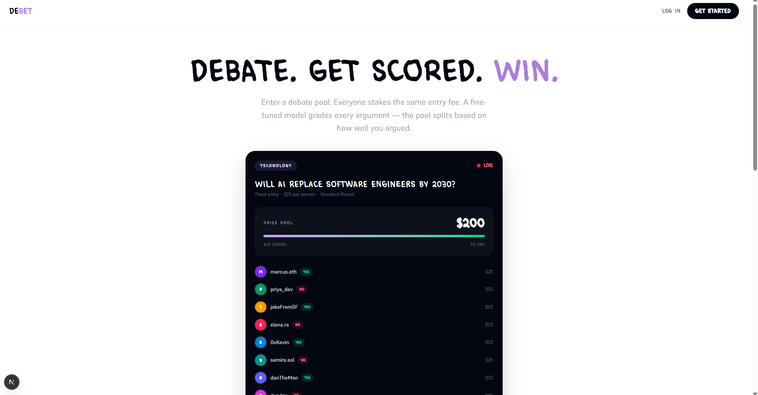 DeBet is a debate-driven prediction market where users take positions on real-world cultural and financial questions, write a short argument defending their stance, and get scored by AI on the quality of their reasoning. The better your argument, the more points you earn. Points are redeemable for real money, meaning the sharpest thinkers actually get paid.