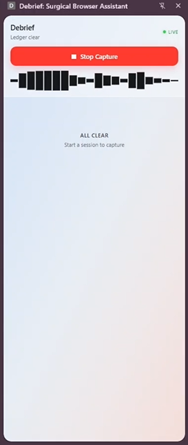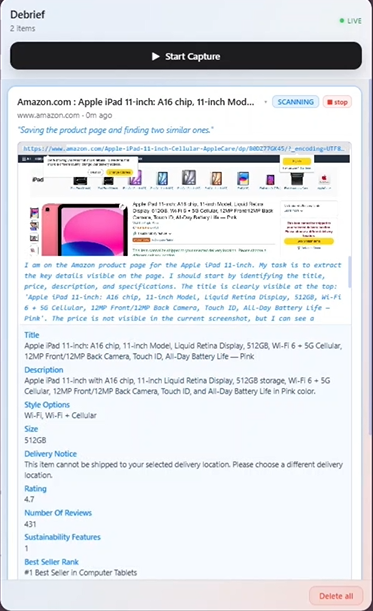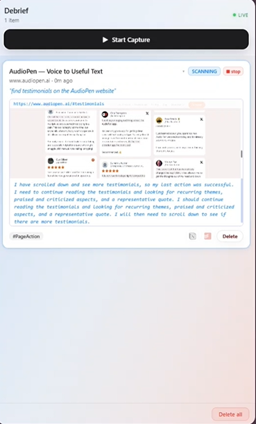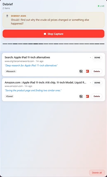 Autonomous Execution — When you speak an intent, Debrief doesn't wait. It runs web searches, sends Amazon Nova Act to navigate live pages autonomously, enriches captures with research, and routes items directly to Notion, Todoist and more — without you leaving the page you're on.