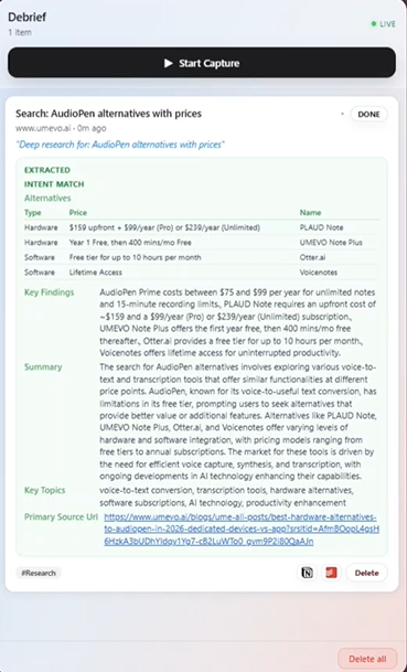We built Debrief because the gap between finding information and doing something with it is where productivity dies. Every existing tool addresses one side: note apps capture, automation tools route, AI assistants answer questions. None of them close the loop inside the browser, in the moment, without breaking your focus. We wanted to build the thing that does all three — and does it the moment you speak.