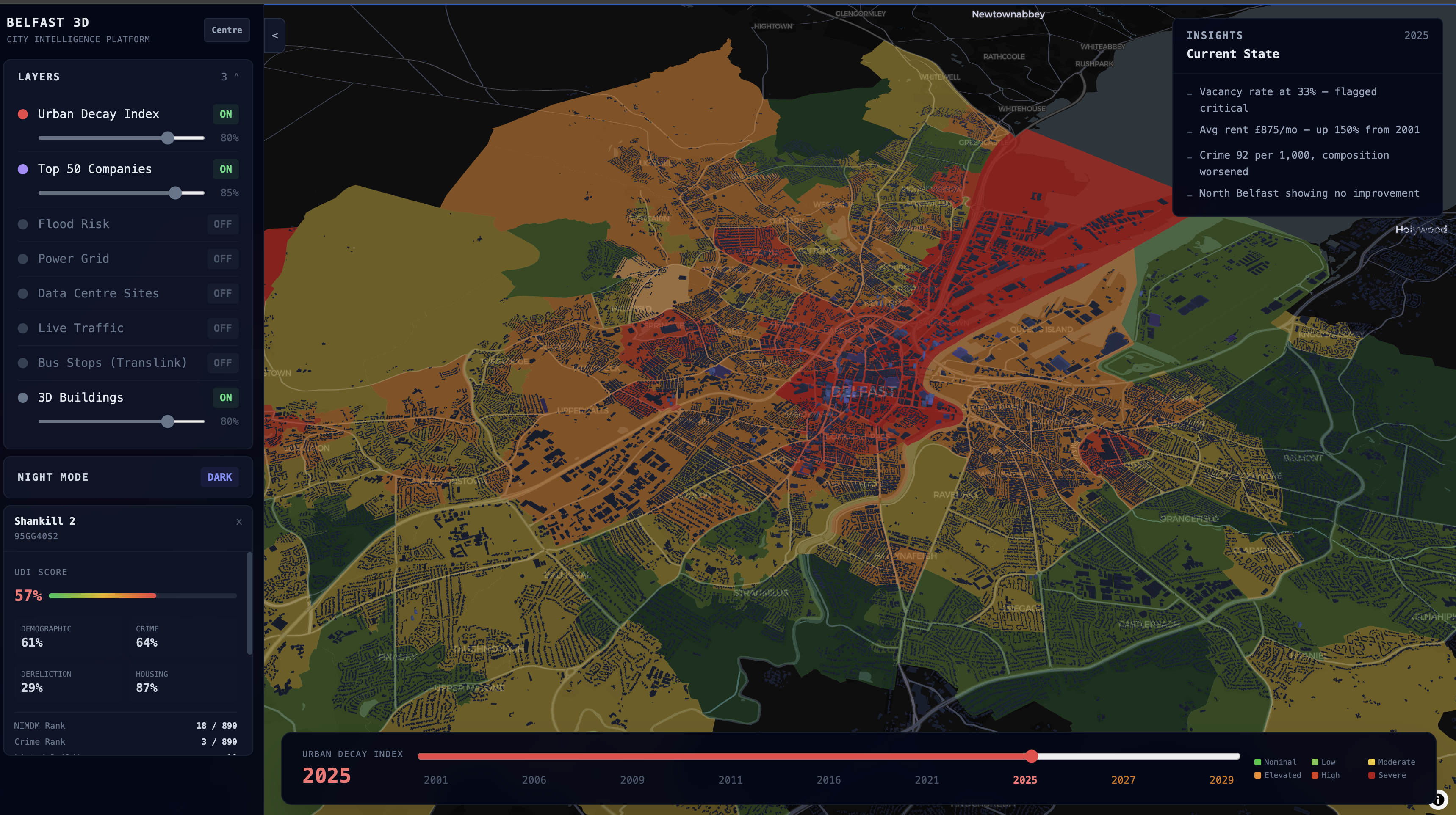 Decay Delay is an interactive map of Belfast that layers urban decay indicators like vacancy rates, crime density, employment levels, and road surface damage over time so you can actually see how areas are changing.