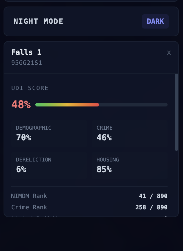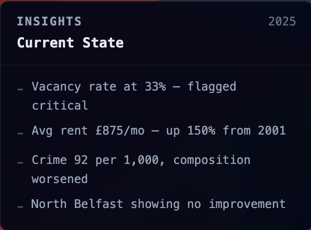 We learned just how fragmented public data actually is in Northern Ireland. The information is technically out there but nobody's joined it up. Once you do join it up the patterns are obvious. Decay doesn't happen randomly, it follows predictable trends that nobody is tracking.