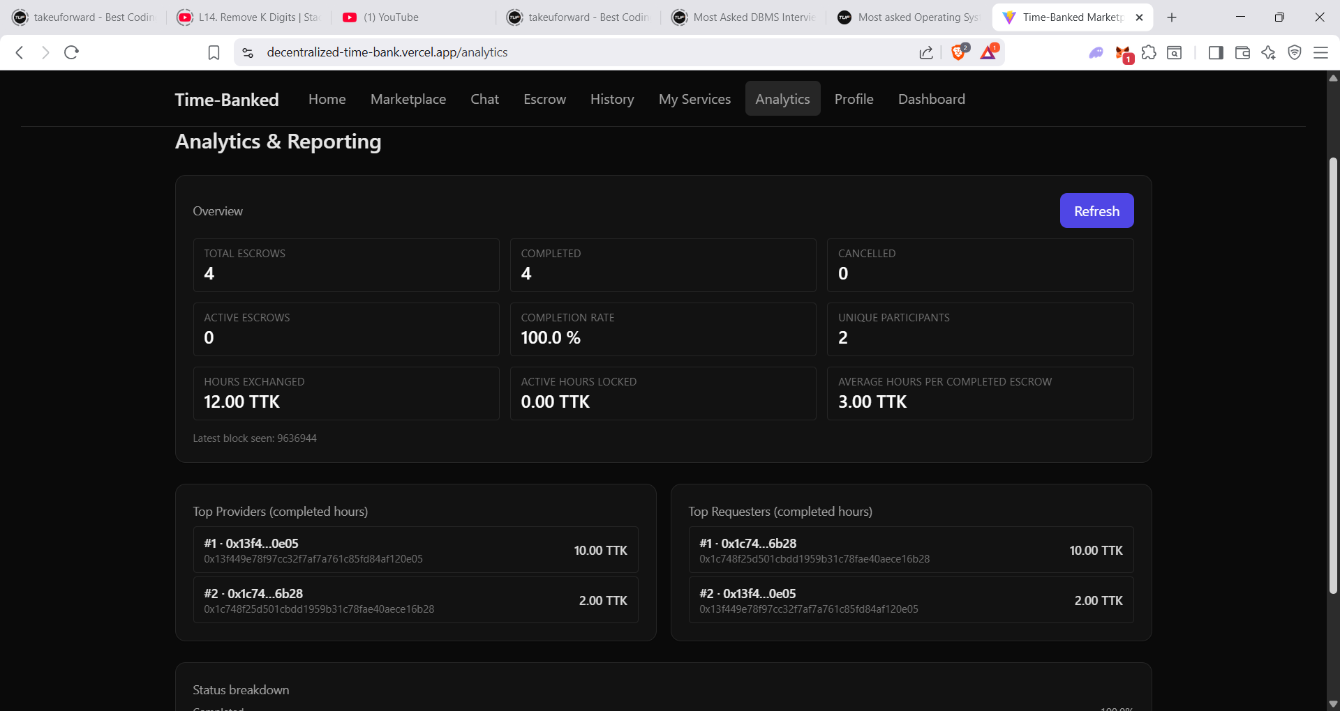 That idea became the foundation for our project: A Decentralized Time-Banking System, where 1 hour = 1 TimeToken (TTK) and everyone can participate in a fair, trustless, and transparent service economy—powered by blockchain, real-time communication, and community-driven exchange.