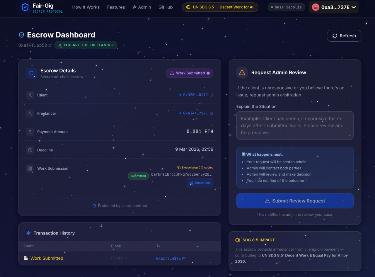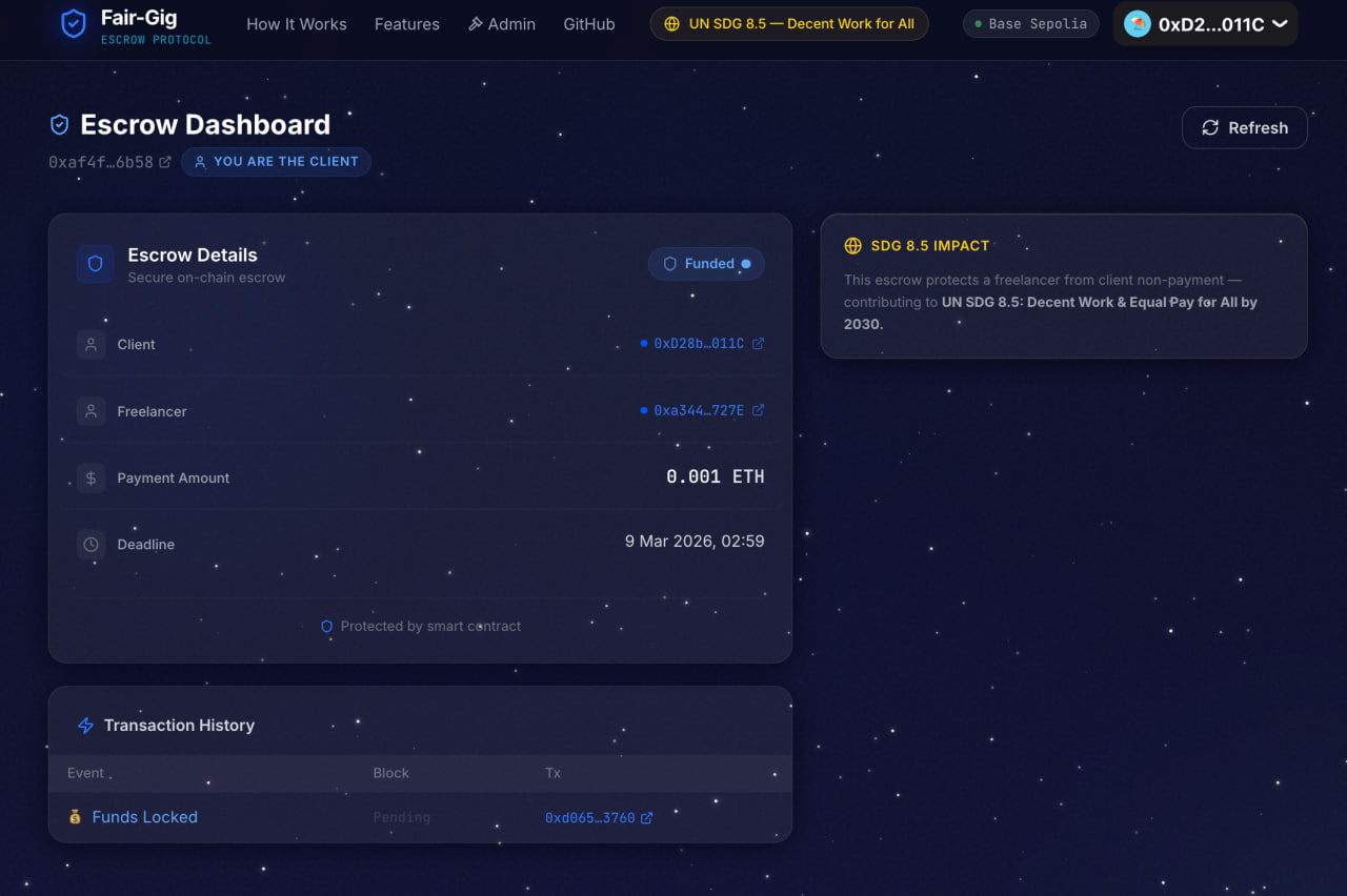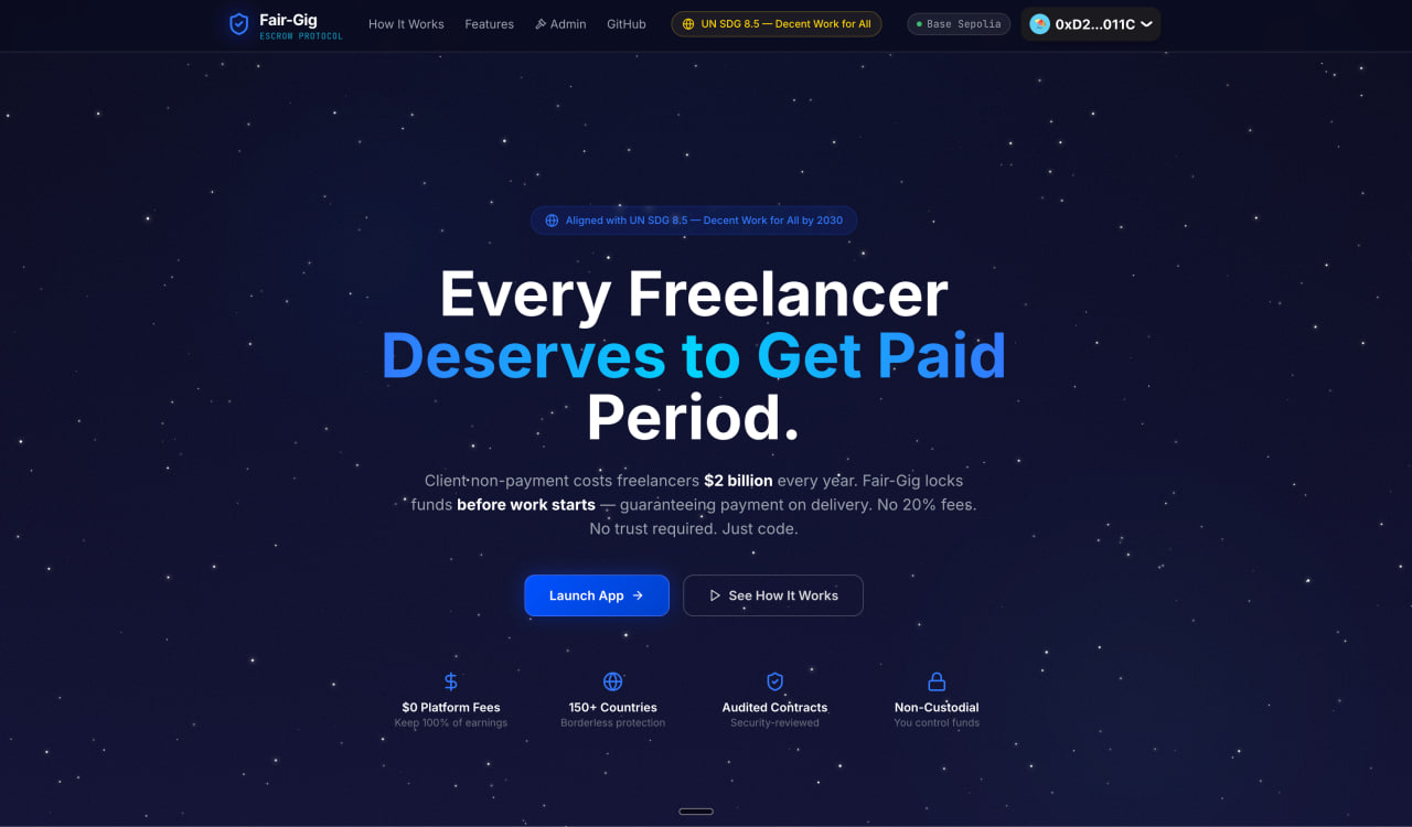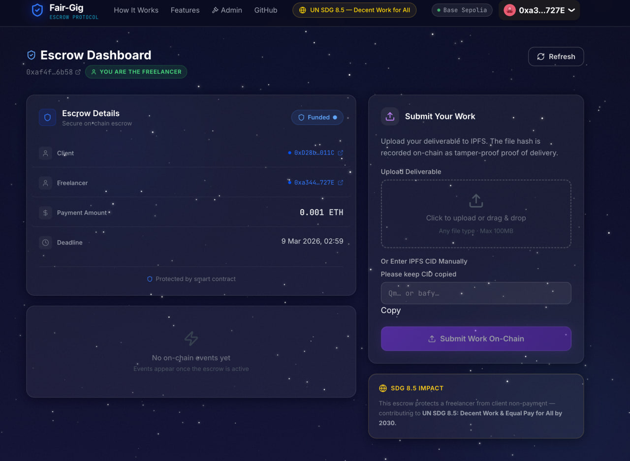 But the story wouldn't leave me. So I started asking: is this just me? It isn't. Not even close. More than 50% of freelancers in developing countries are women. Graphic designers in Lagos. Translators in Cairo. Developers in Manila. Video editors in Nairobi. Creative women, skilled women — women pouring their expertise into work that the internet makes borderless, but the legal system leaves unprotected. Together, they lose an estimated $2 billion every year to non-payment and wage theft. Not because they failed to deliver. But because the power was never on their side. Platforms like Upwork exist, yes. But they take 20% commission. For a woman earning $500 a month — which is real, which is common — that's $100 gone before she can pay rent. That's not a solution. That's another form of extraction dressed up as help. Women are still more likely to take the worst jobs in the labour force — insecure, unsafe, and poorly paid — and inclusive economic growth remains far out of reach as long as that's true. UN Women The gig economy promised freedom. What it delivered, for millions of women, was precarity with a prettier name. Then I found the UN's Global Goals — and two of them stopped me cold. SDG 8: Decent Work and Economic Growth — specifically Target 8.5, which calls for full and productive employment and equal pay for work of equal value for all women and men by 2030. And SDG 5: Gender Equality - Target 5.a, which demands equal rights for women to economic resources, financial services, and the protections that let them actually keep what they earn. And SDG 10: Reduced Inequalities — because in developing countries, income inequality has been rising, and women — especially those without safety nets — are consistently more likely to fall below median income. UN Women Three goals. All pointing at the same wound. But goals don't pay bills. Promises don't protect paychecks. Code does. That's why Fair-Gig was born — on International Women's Day, for every woman the system was never built to protect.